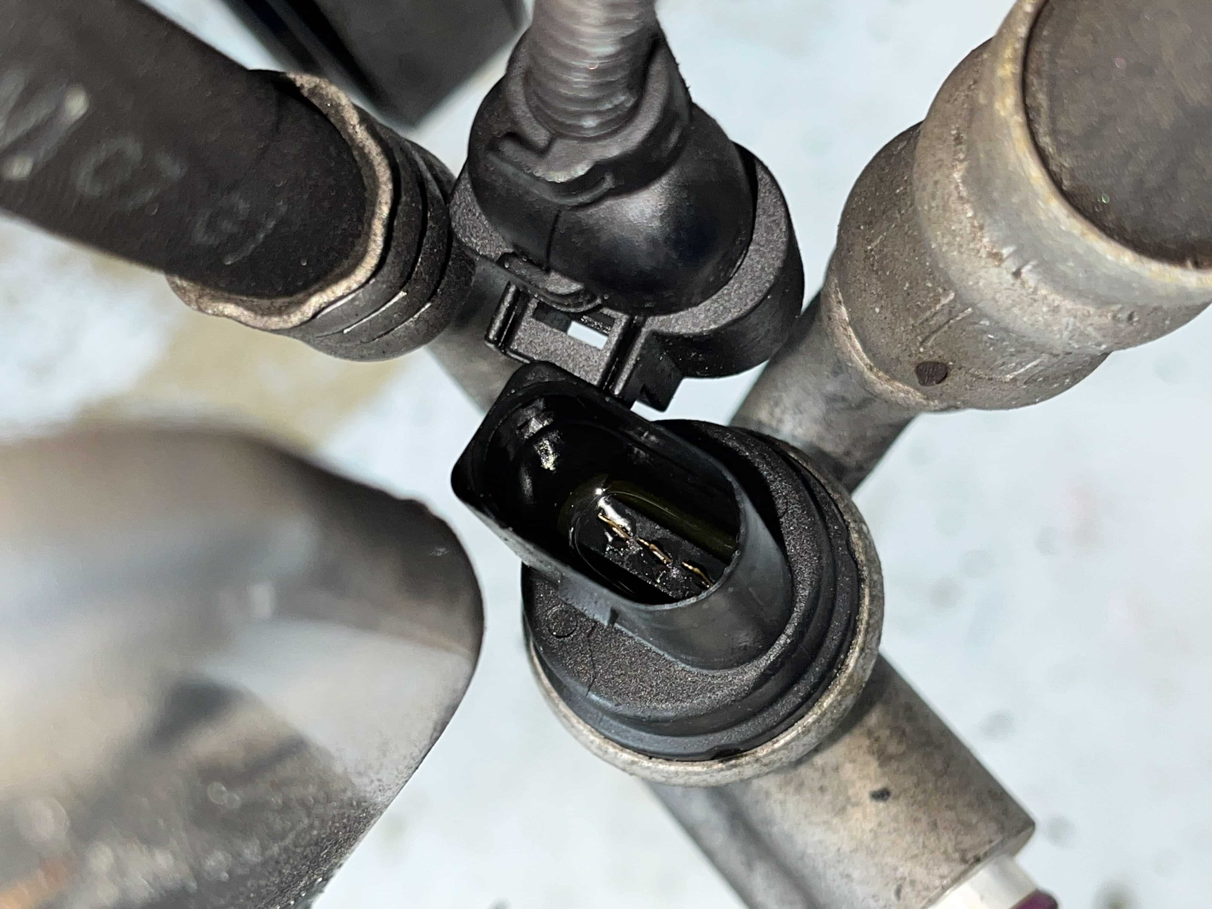 ハイプレッシャーセンサーはエンジンルームから見て左下付近にあり、上から覗くとコネクターが見える。