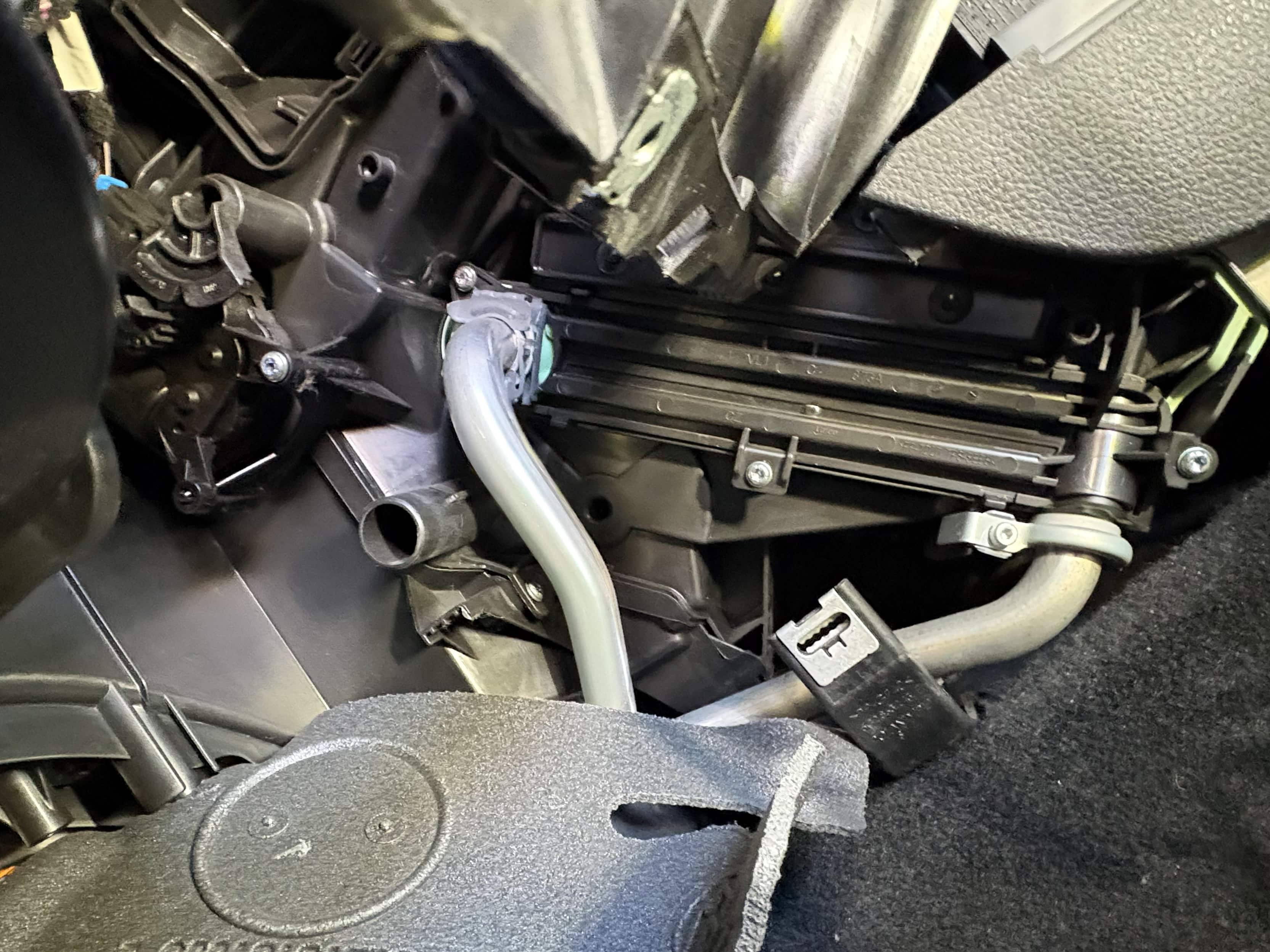 取り外し後、逆の手順で新品ヒーターコアを装着しクーラントのエア抜きを行い、ヒーターの作動を確認する。