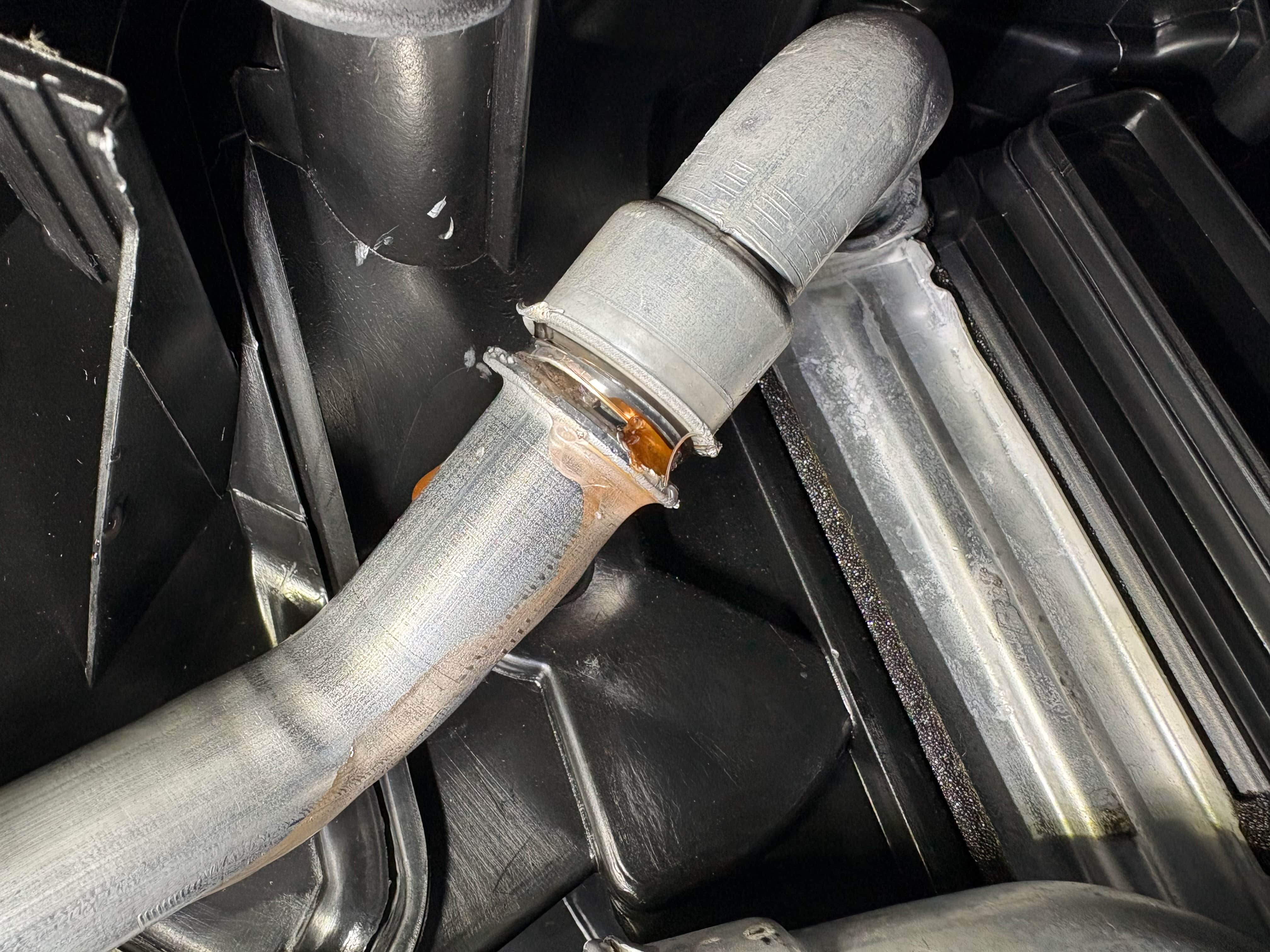 5.T15トルクスで固定されたメタルバンドを外し、ヒーターパイプの連結を解除していく(固着時は変形を避けながら慎重にクリップクランプツールで外していく)。