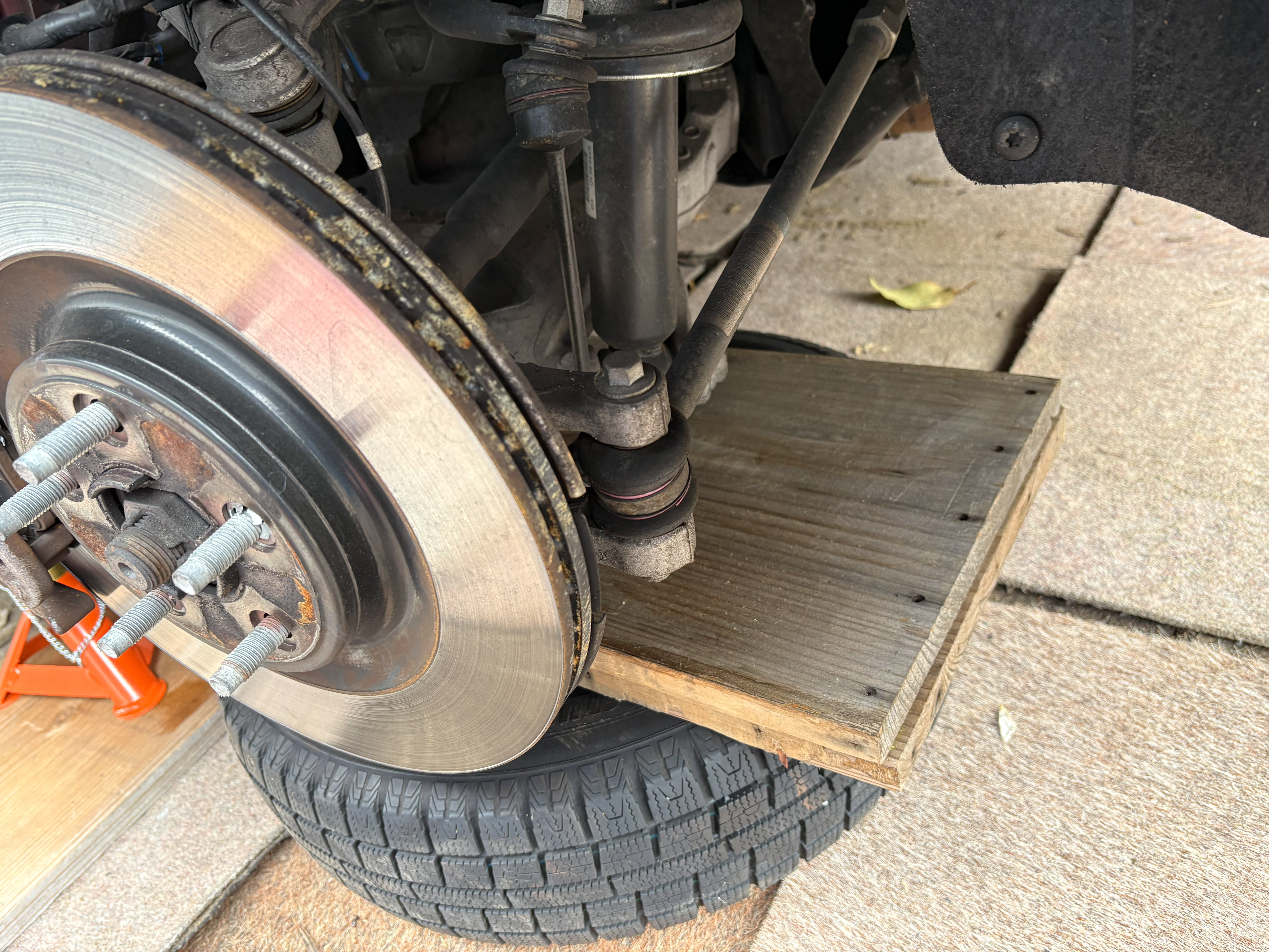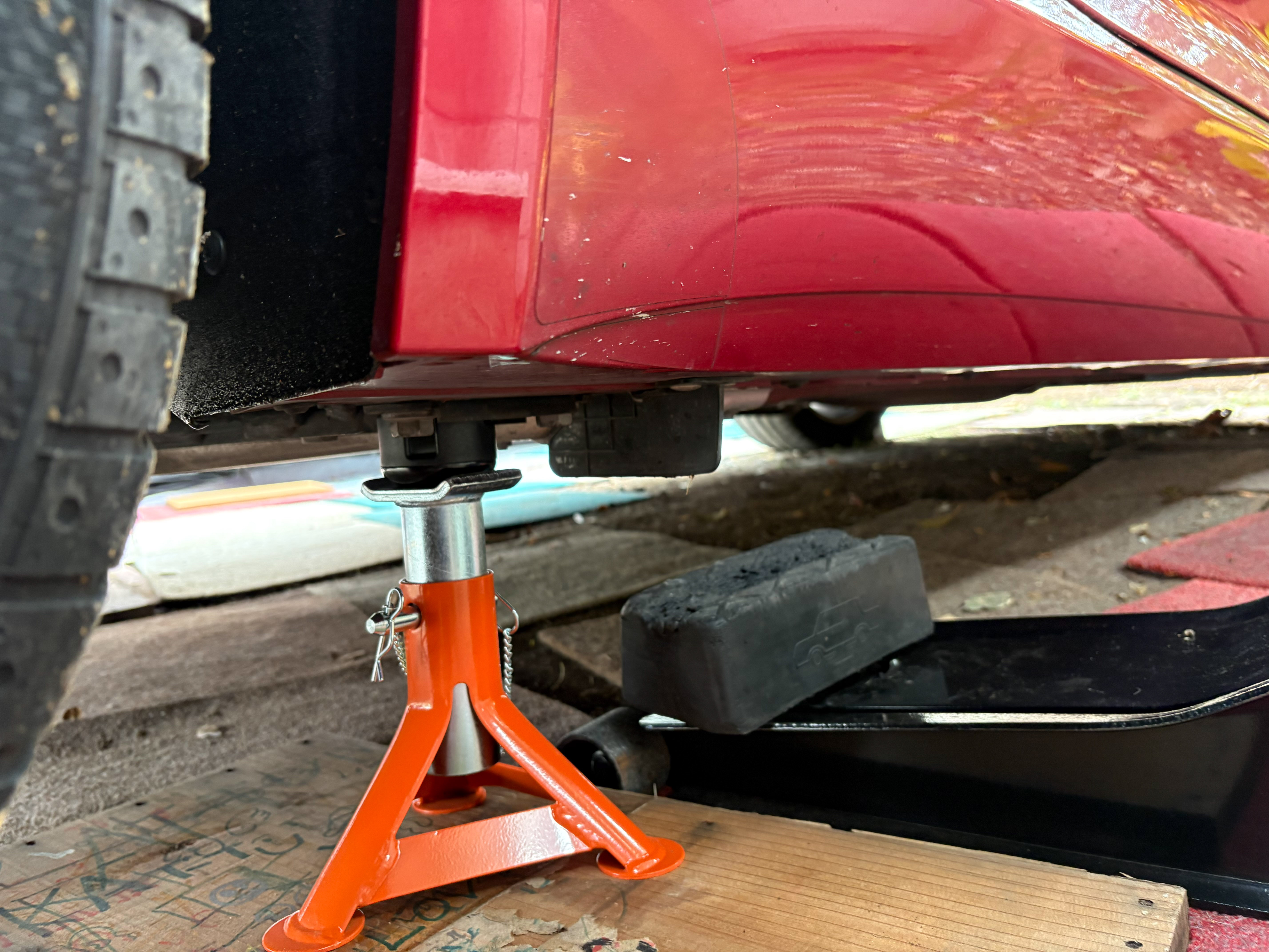 ジャッキアップポイントで固定し、フロント同様に補強用のブレース(名称が分からない)付近をジャッキアップポイントとしてホイールを外すことにした。