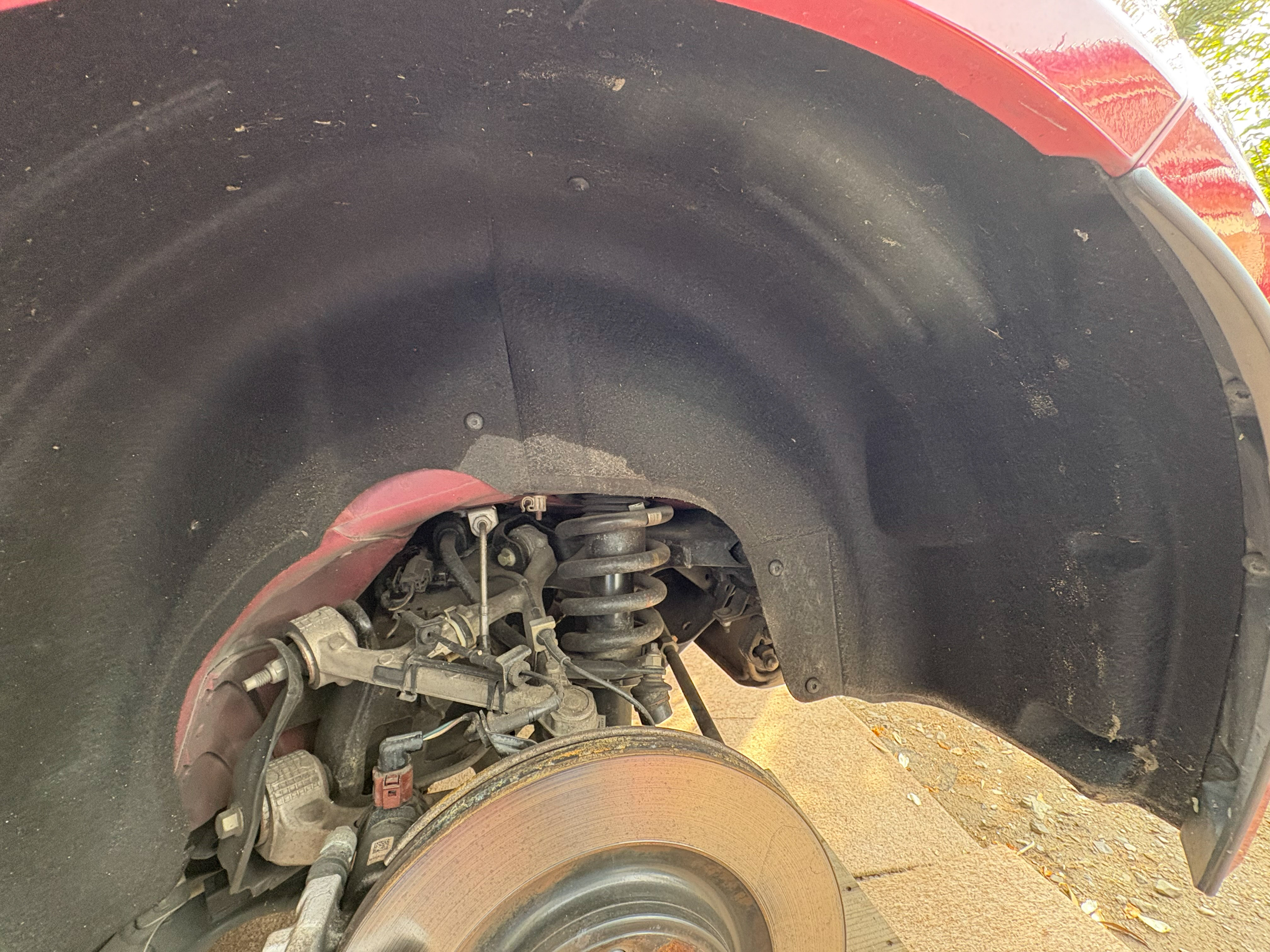 19mmソケットでホイールナットを取り外していき、まずホイールアーチ内のライナーを固定しているT27トルクススクリューを左右それぞれ4本ずつ外した。