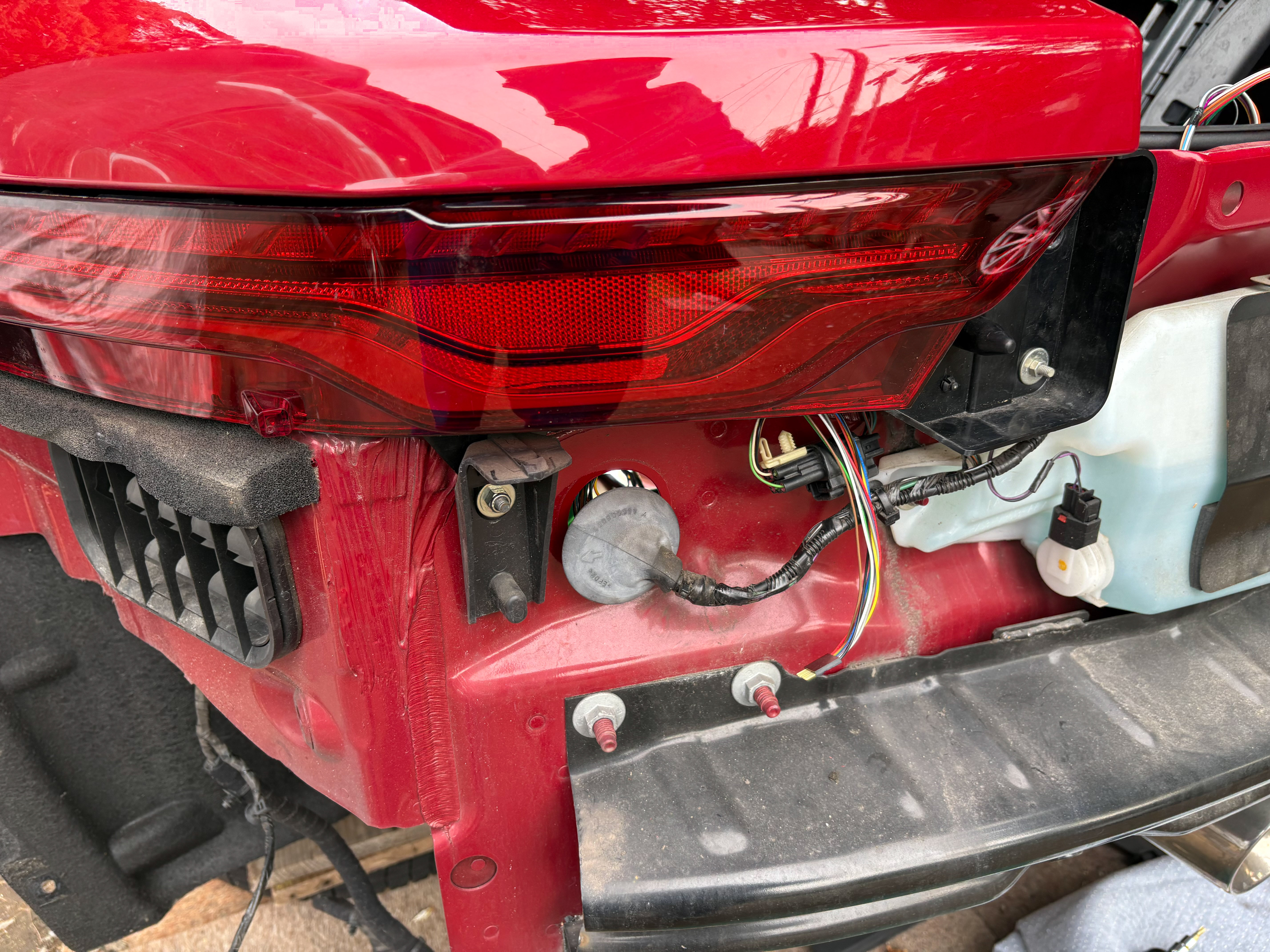 移植後、バンパーを仮合わせしてテールライトの点灯確認とリアカメラの接続チェックを行い、異常がないことを確認してから本取り付けを行った。