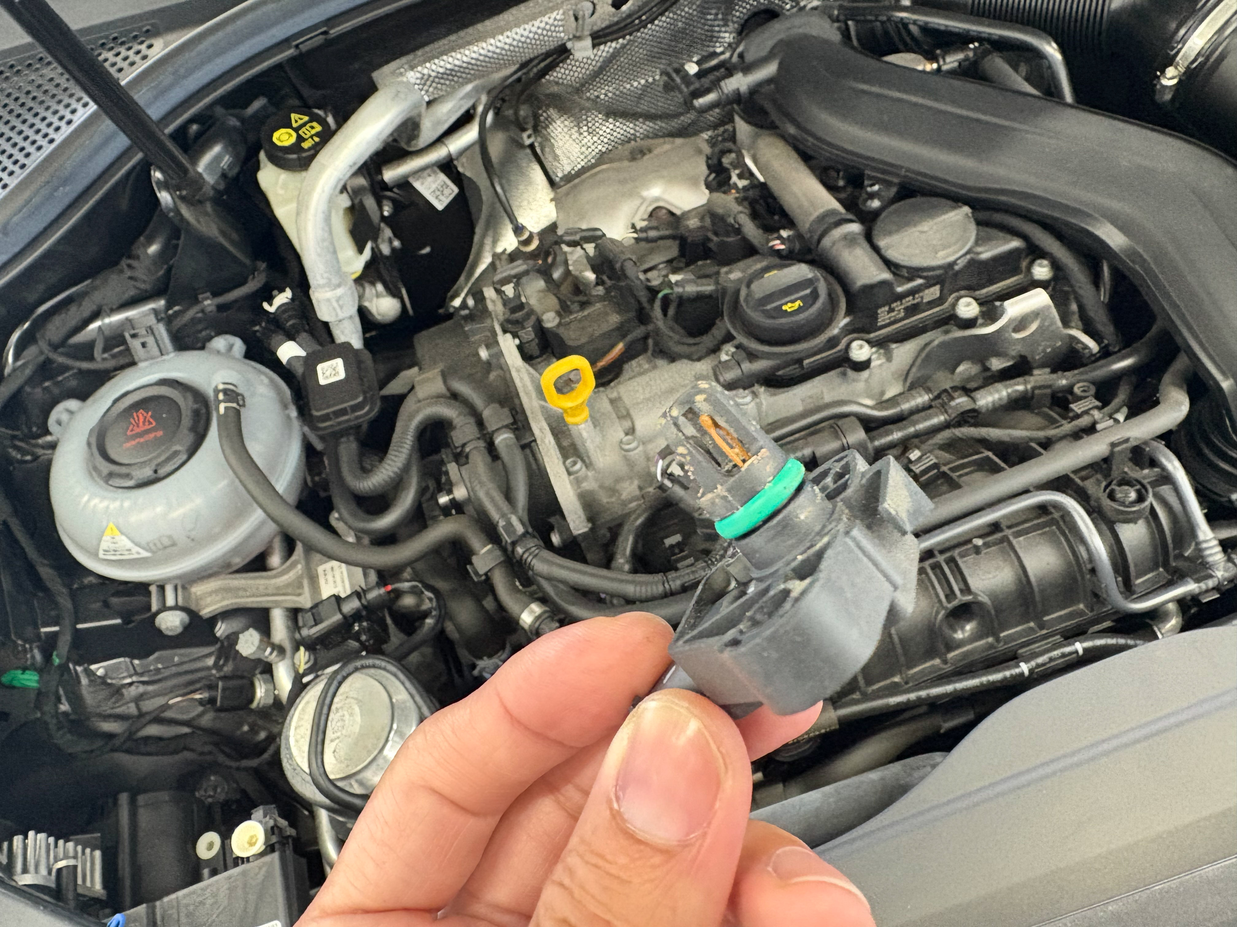 それなのにクーラントがじわじわ減る…というケースで黄色枠が囲われている付近にチャージエアプレッシャーセンサーが取り付けられているのでセンサー部を確認してみると、どうも様子がおかしい事に気づいた。