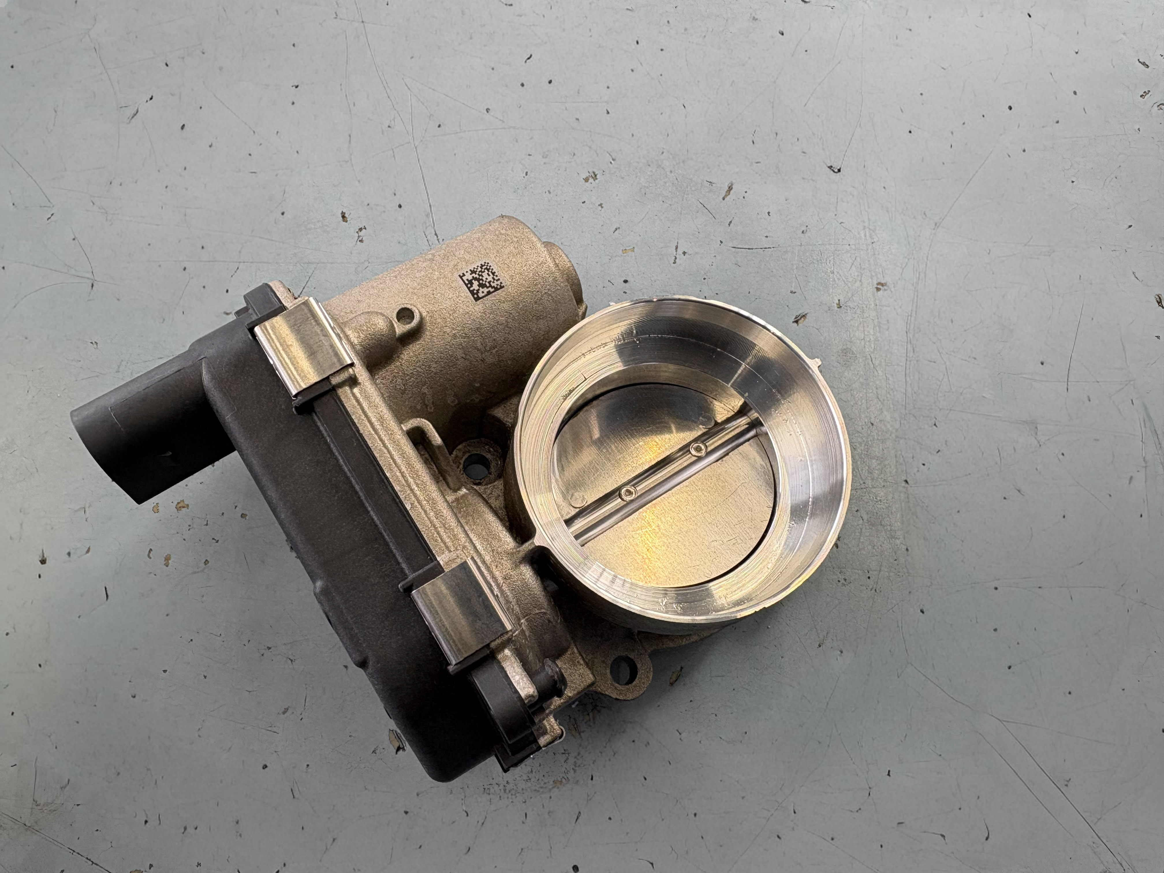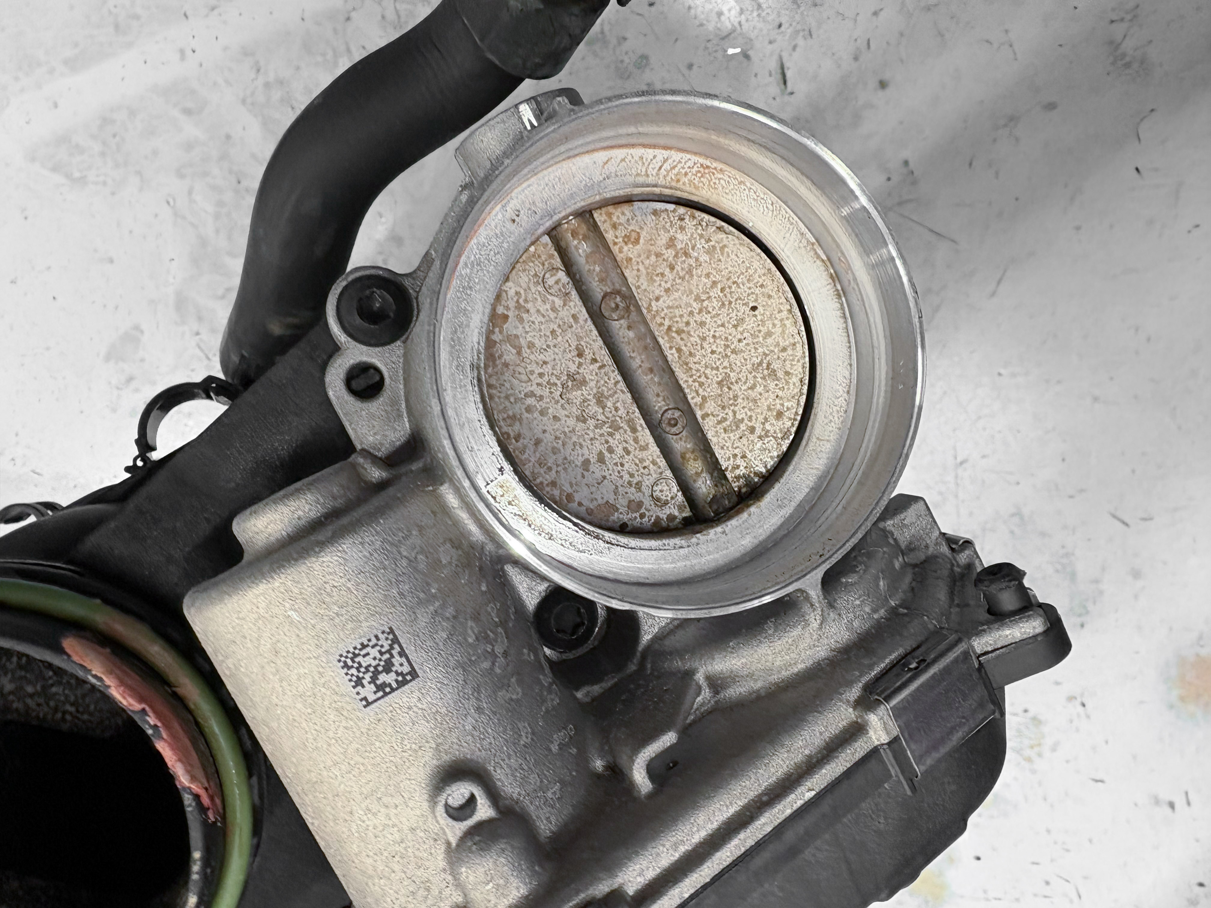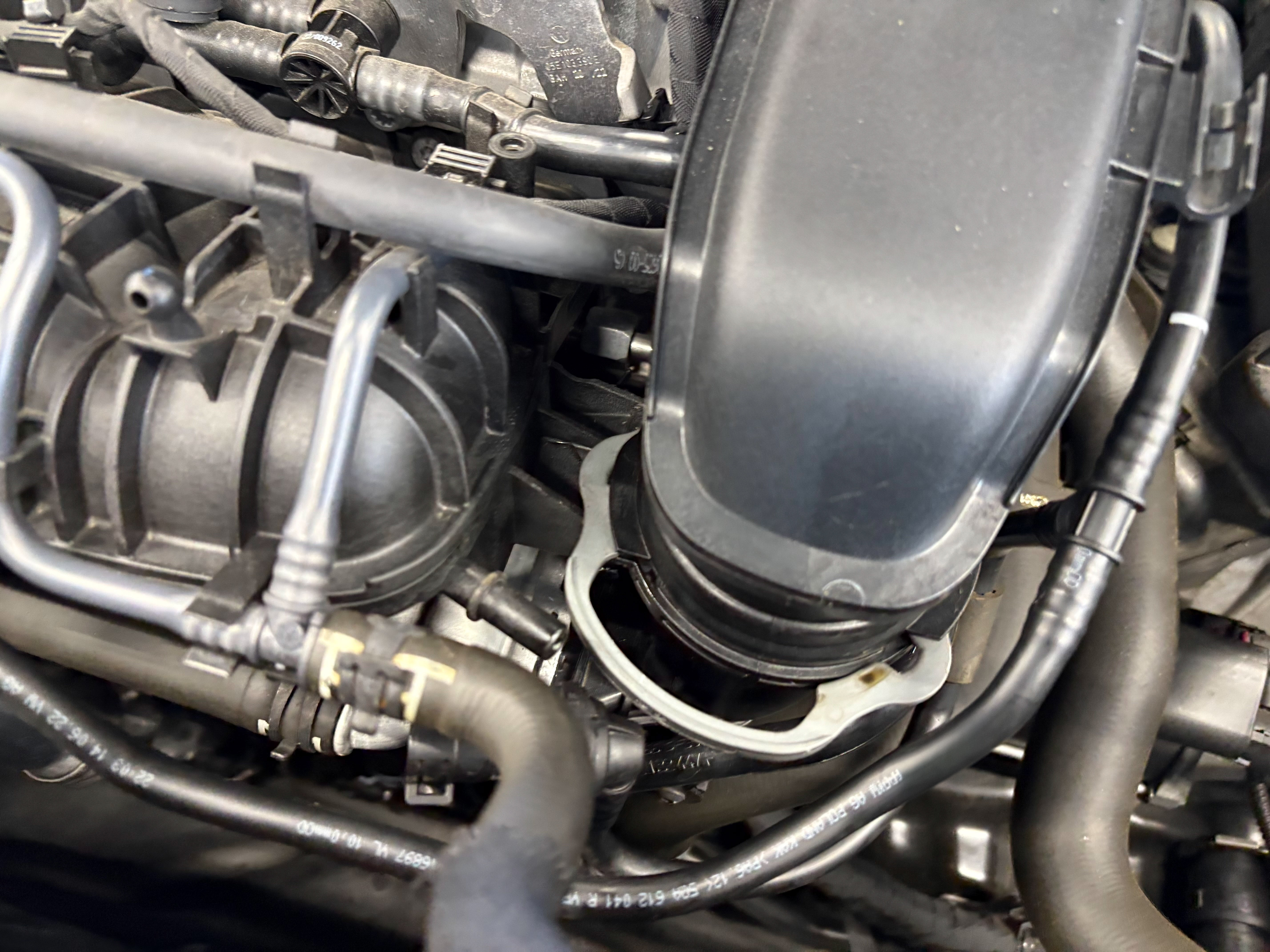 スロットルバルブクリーナーでスロットルバルブを細かく清掃しインテークマニホールドも内部を綺麗に洗浄していき新品チャージエアクーラーへの交換作業を進めていく。