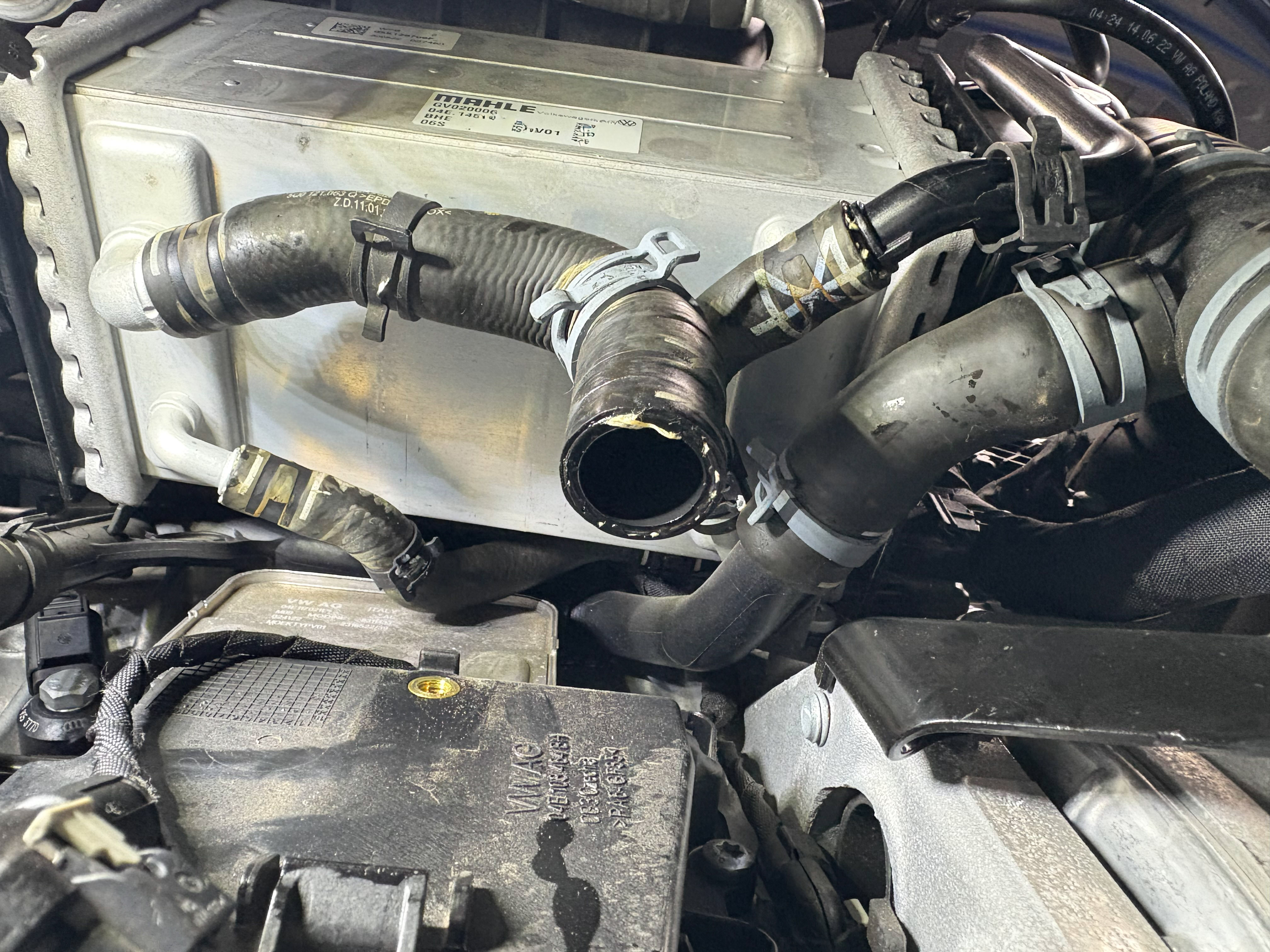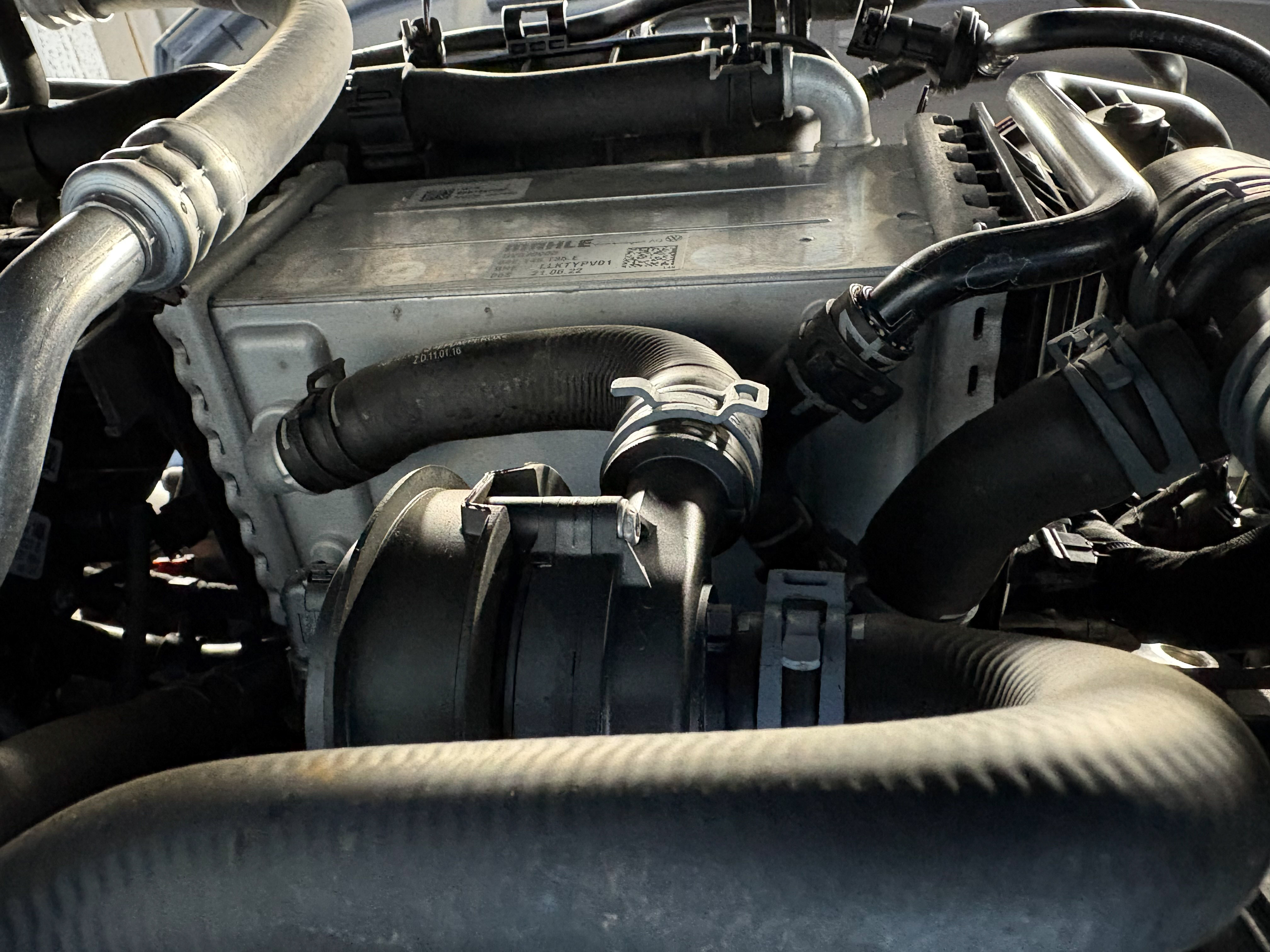 ゴルフ8や同世代の1.0L/1.5L TSI車でクーラント警告灯が点灯したら、高確率でチャージエアクーラーの内部漏れになる。