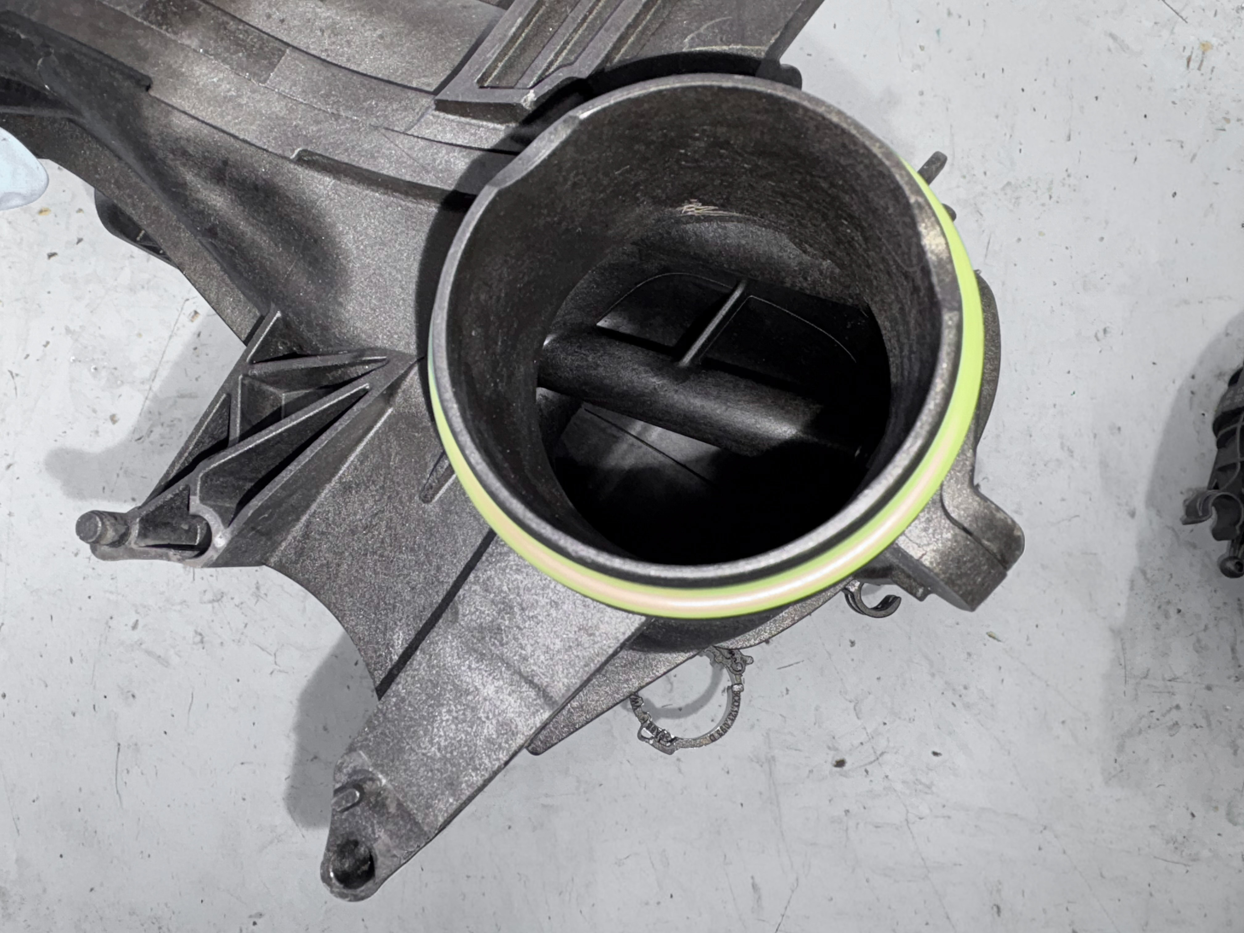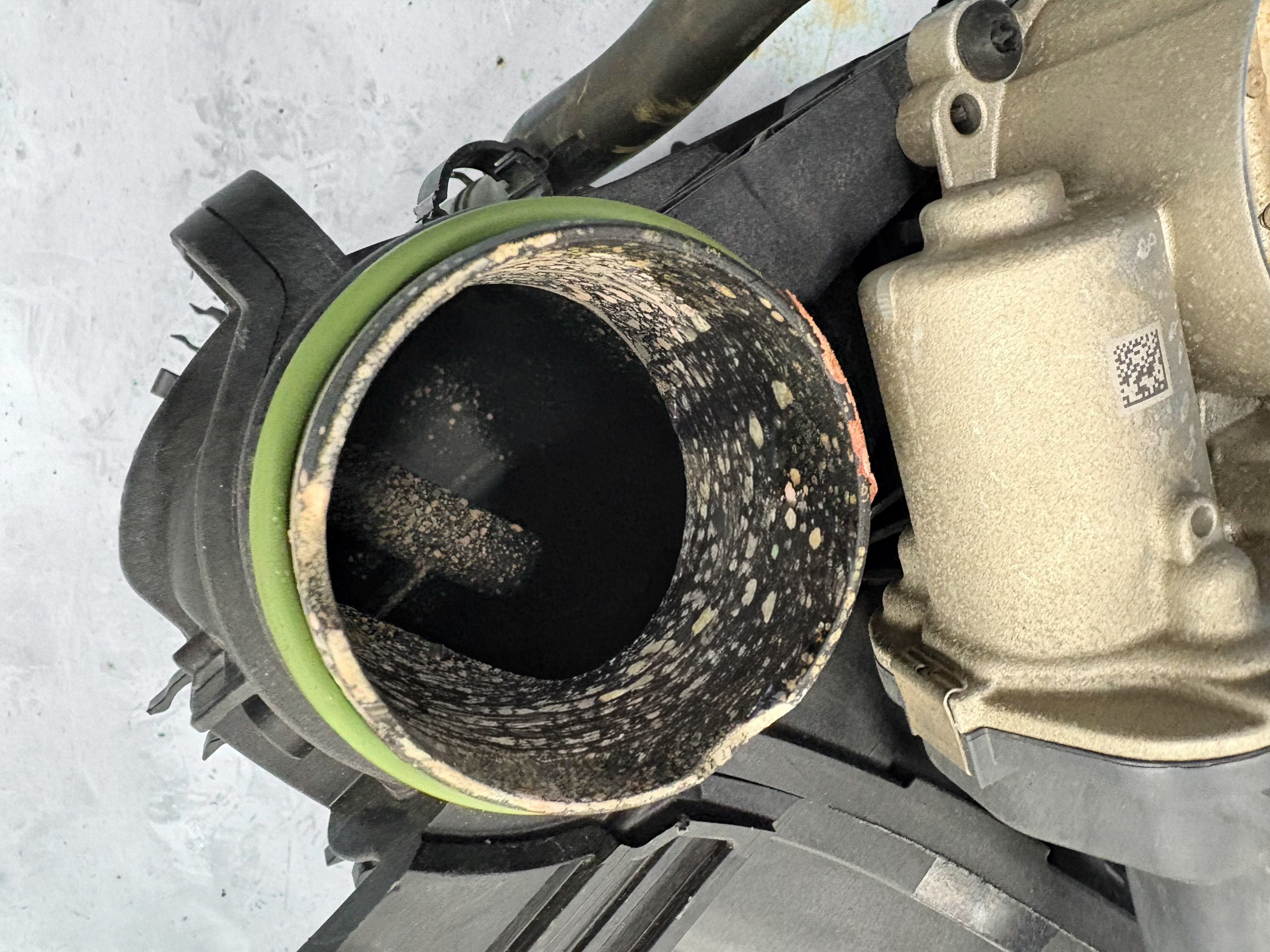 取り外し後、インテークマニホールド内部およびチャージエアクーラーの状態を確認したところ、想定以上のクーラント漏れが発覚しインテークマニホールドとインテークポートはクーラントの結晶が酷く蓄積していた。