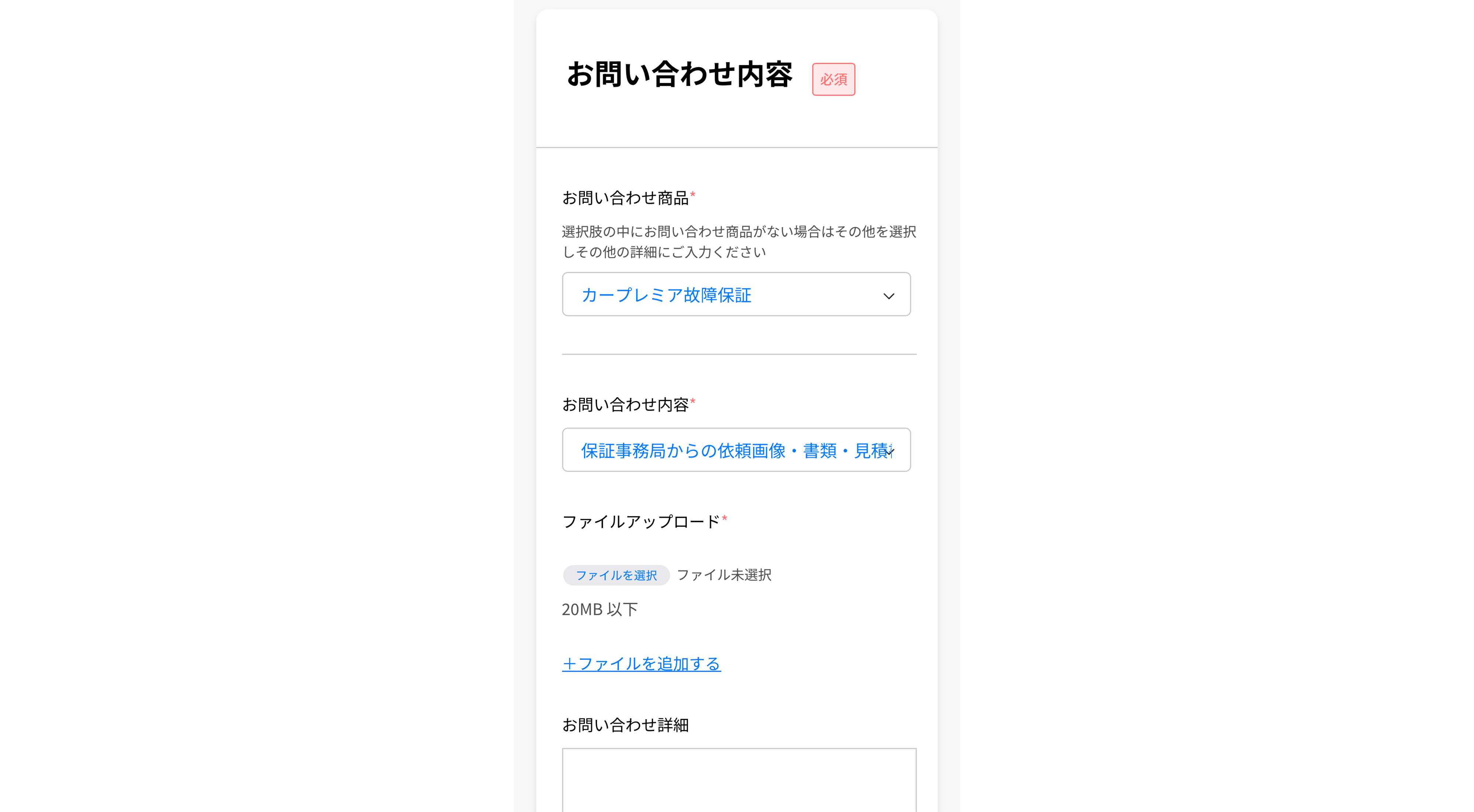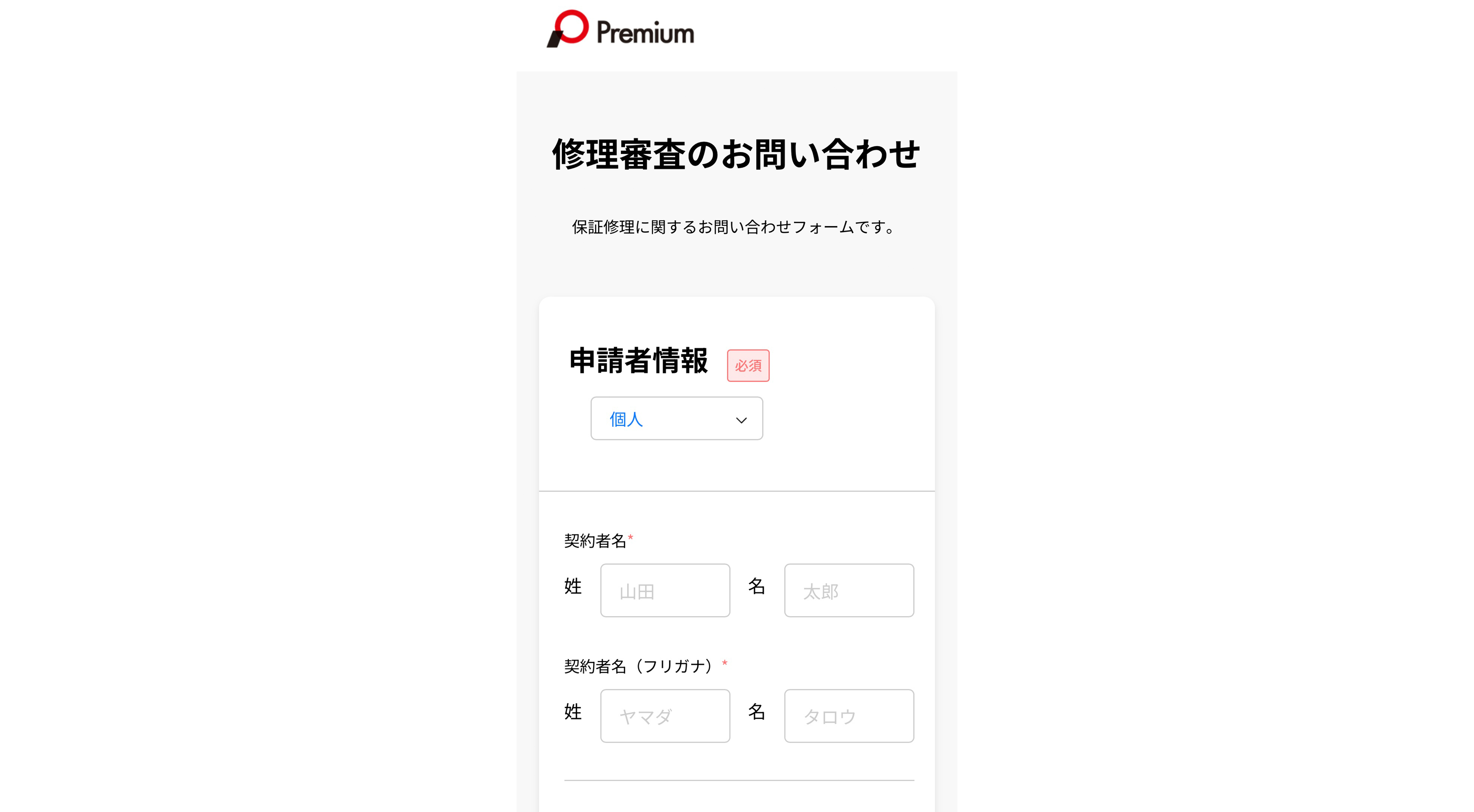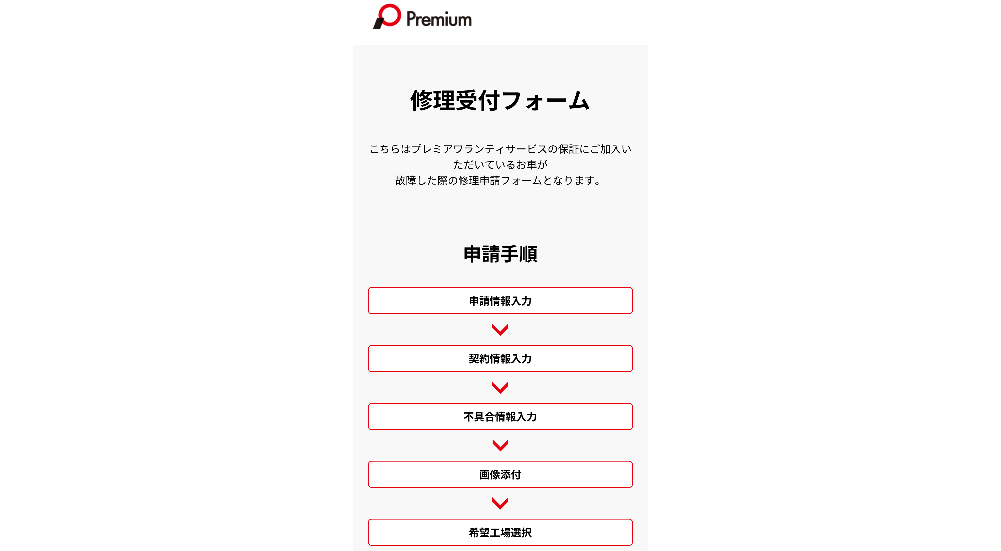 カープレミアの修理の依頼をするには、初めに「修理受付フォーム」の入力と「カープレミア提携工場」の選択が必須になる。