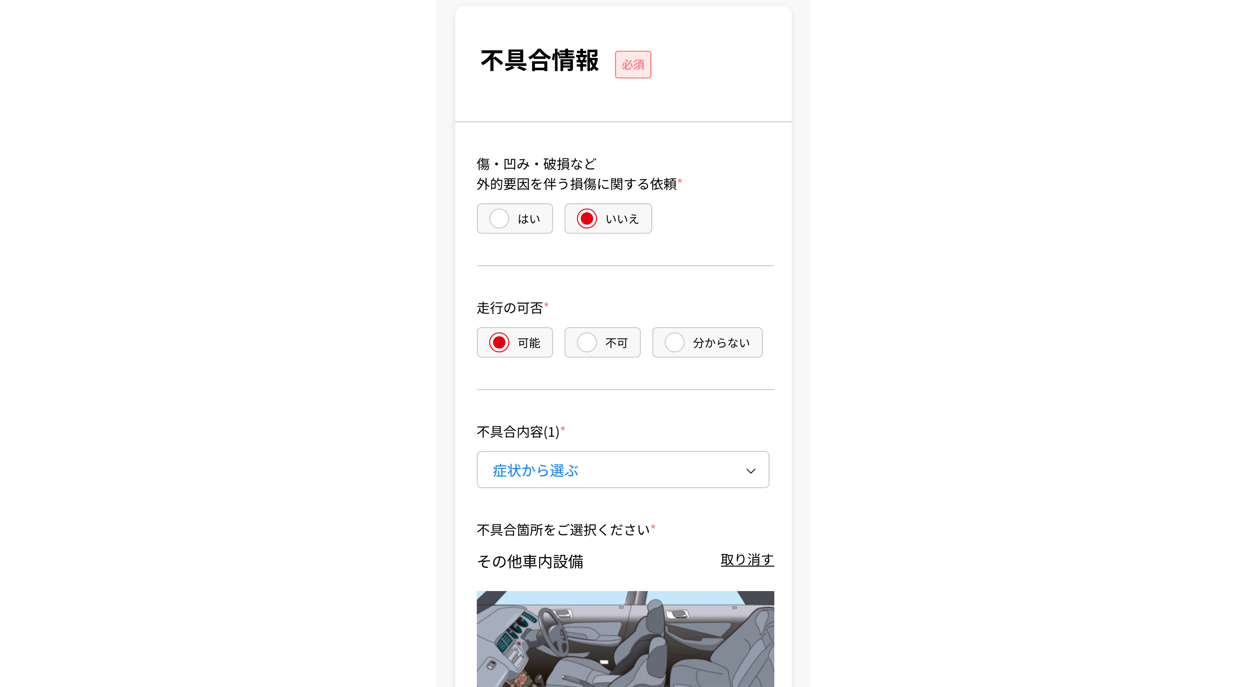 修理受付フォームに契約情報を打ち込み、車両の外観の写真や不具合症状を選択をする。