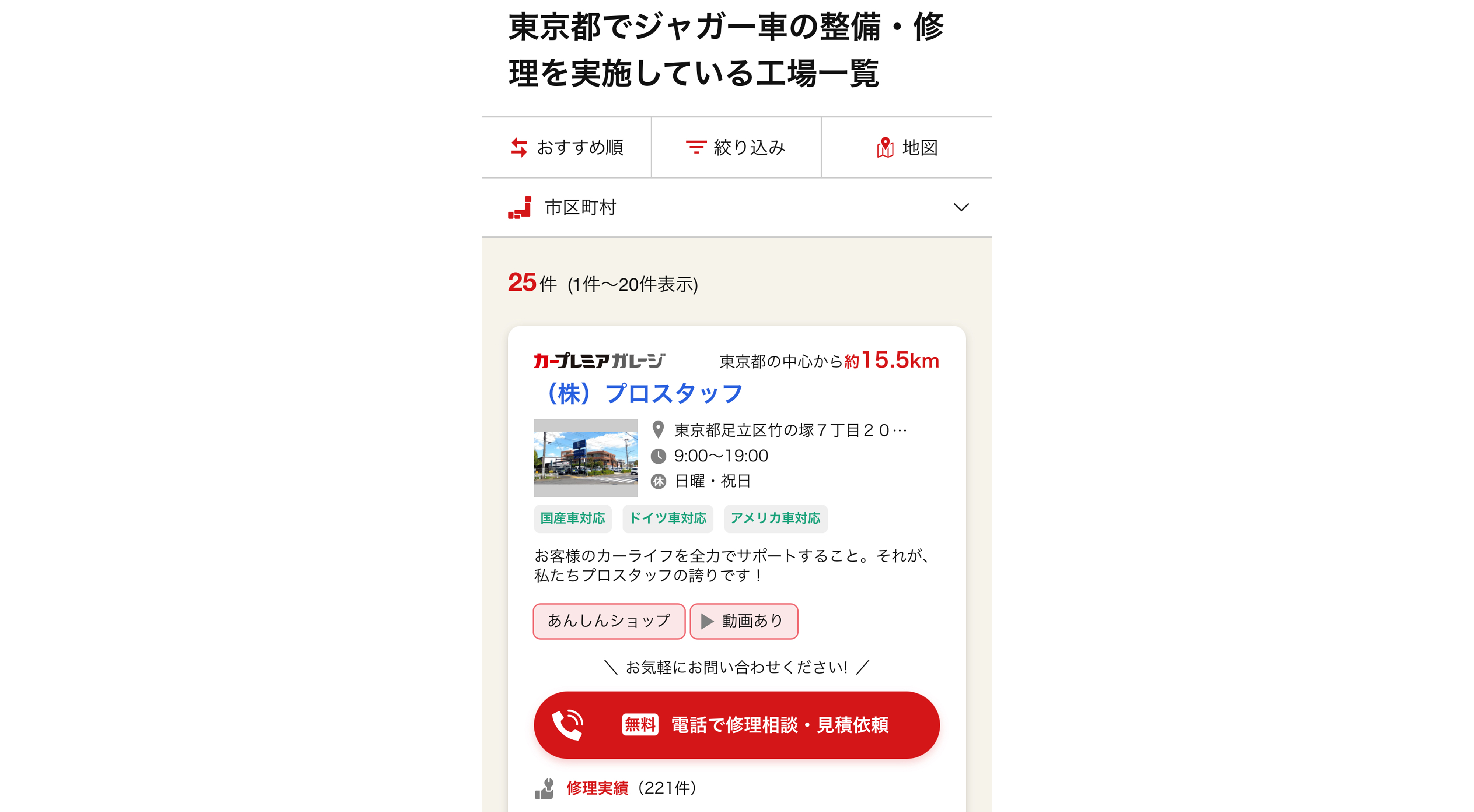 輸入車を扱っている整備工事は都内の方が多いと考えて、2店舗に絞り希望工場の情報を入力。