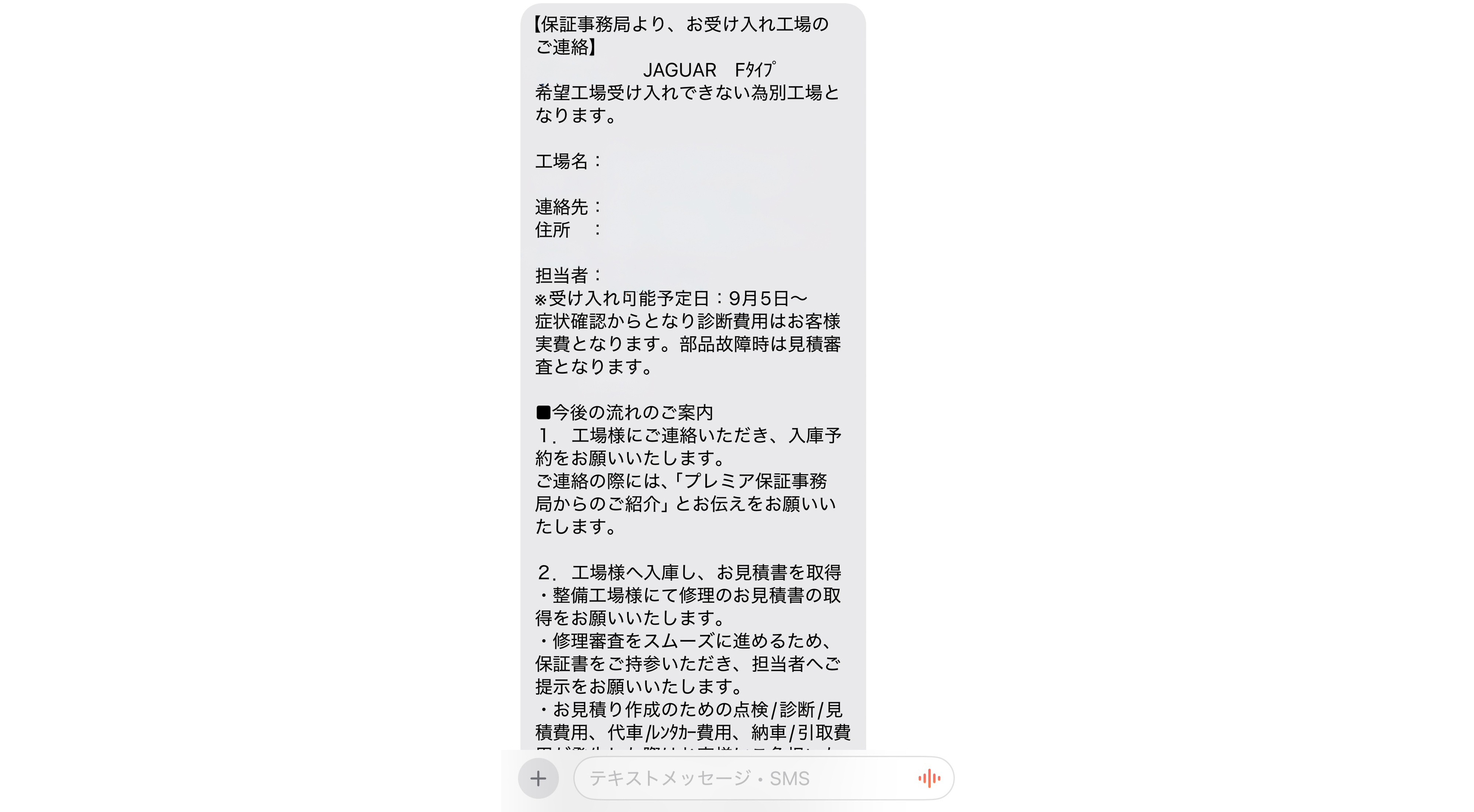 都内で絞った提携工場は受付が出来ないと担当者から電話があり、代わりに千葉県で受け入れ可能な店舗をSMSにて紹介するということで、上記のようにSMSでメッセージが届いた。