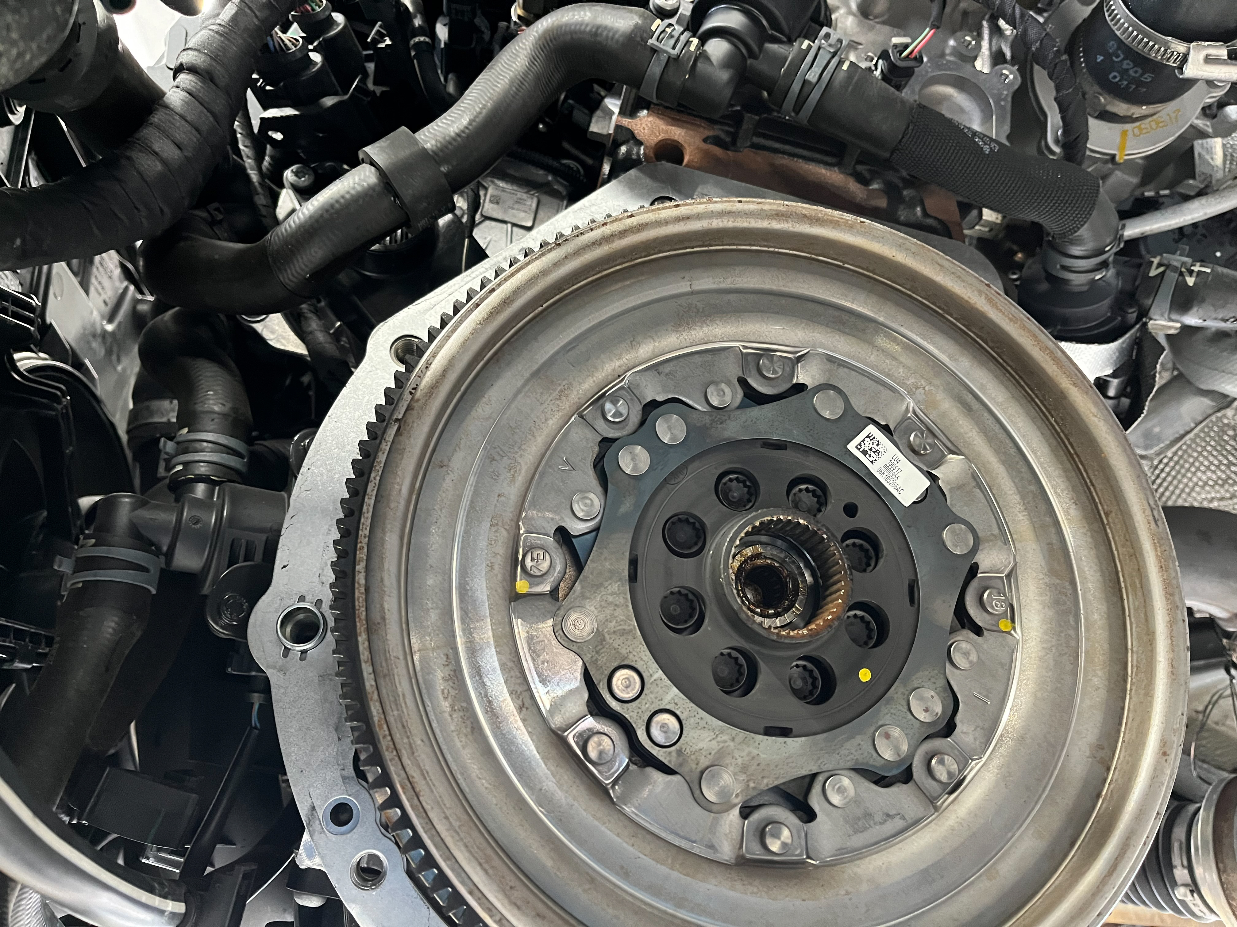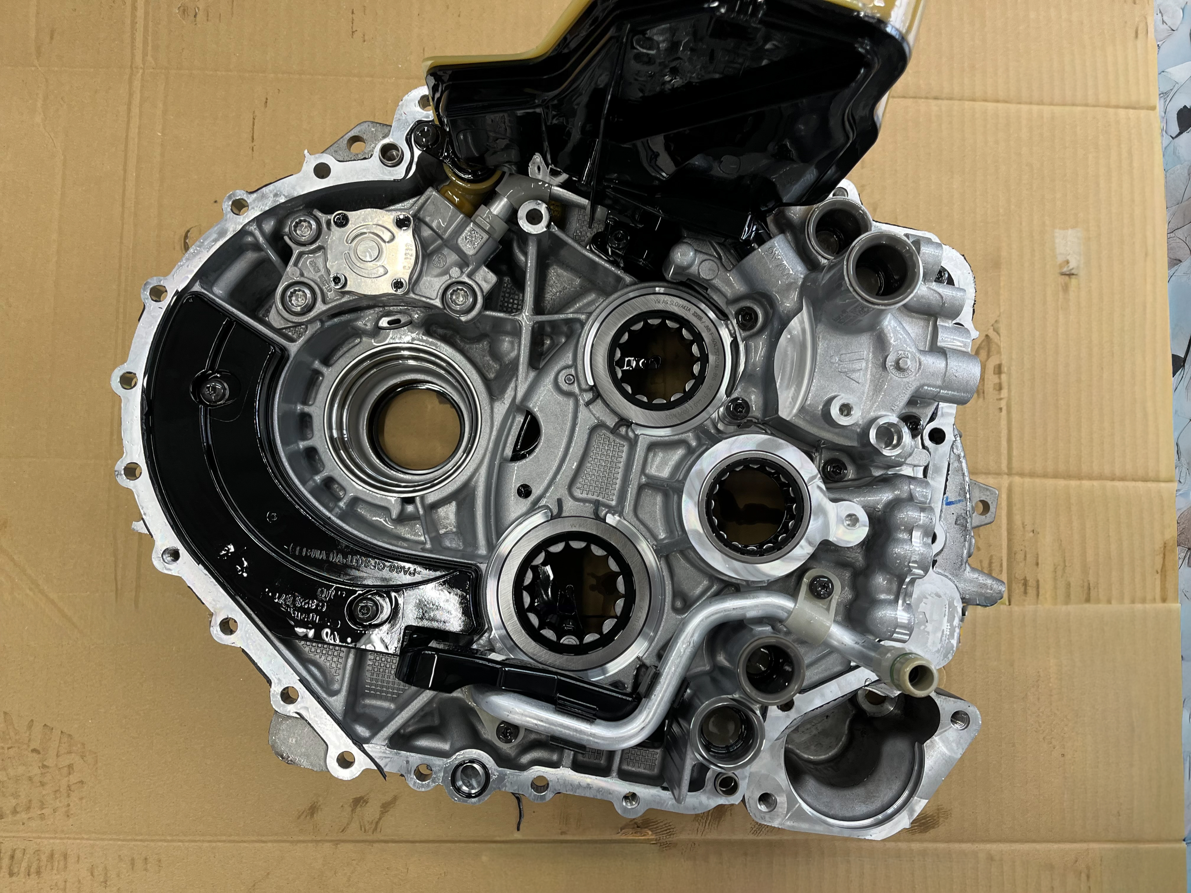 湿式DSGクラッチも慎重に持ち上げて取り外して、ハウジングボルトを外し、シーリングで固着したハウジングをこじりながら分離する。