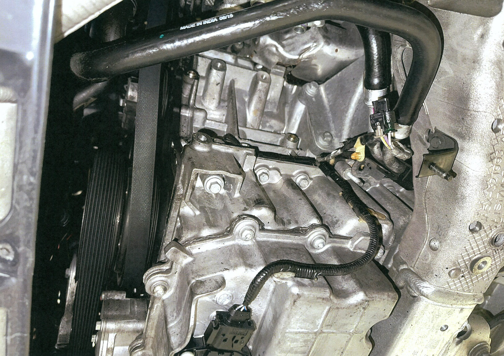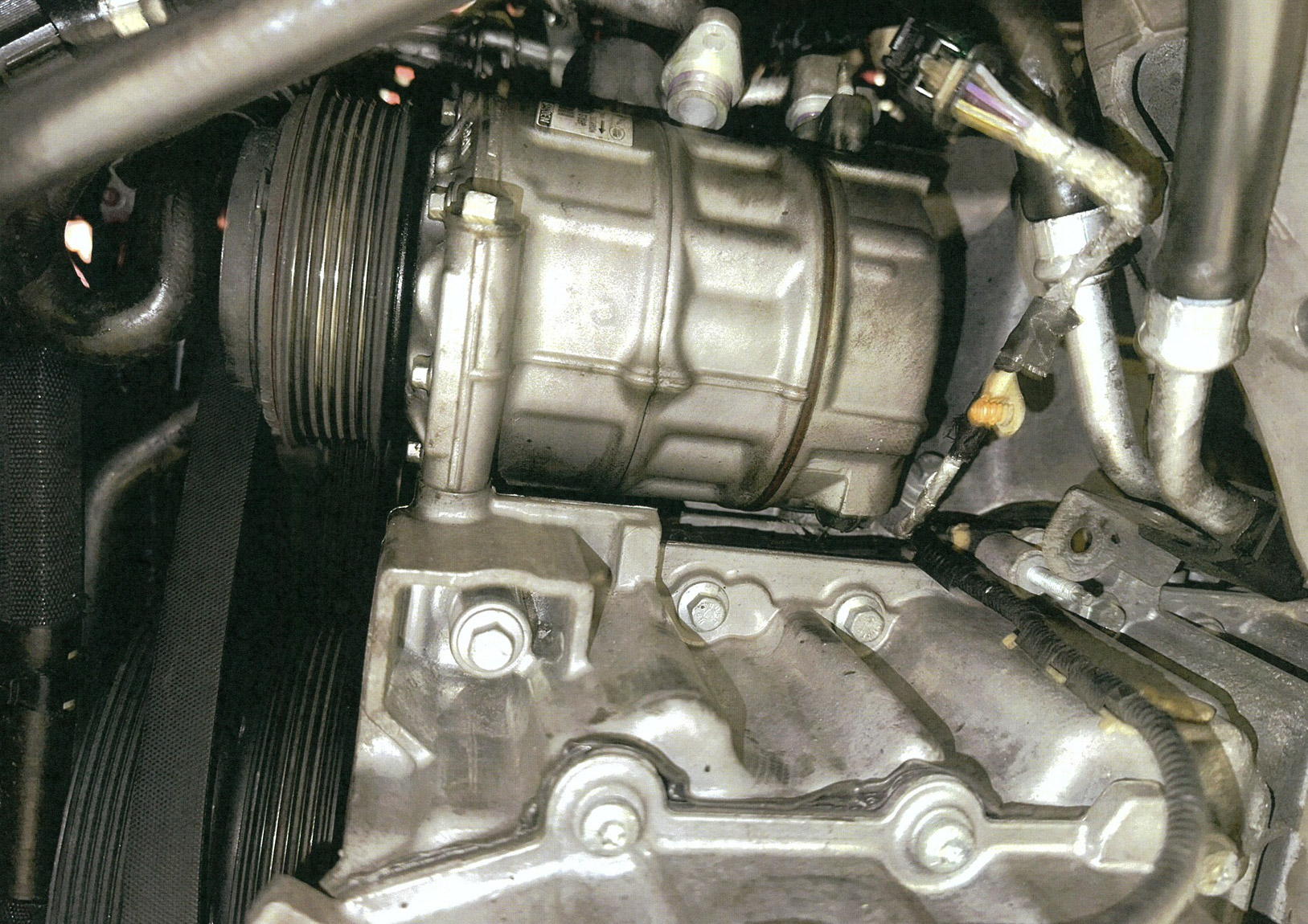 コンプレッサーはオルタネーターの反対側に下廻りから見える位置にある。
