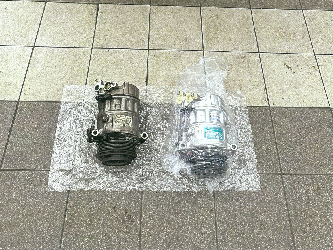 取り外したコンプレッサーとリビルト品を見比べてみるとリビルト品ほぼ新品と見分けが付かない。