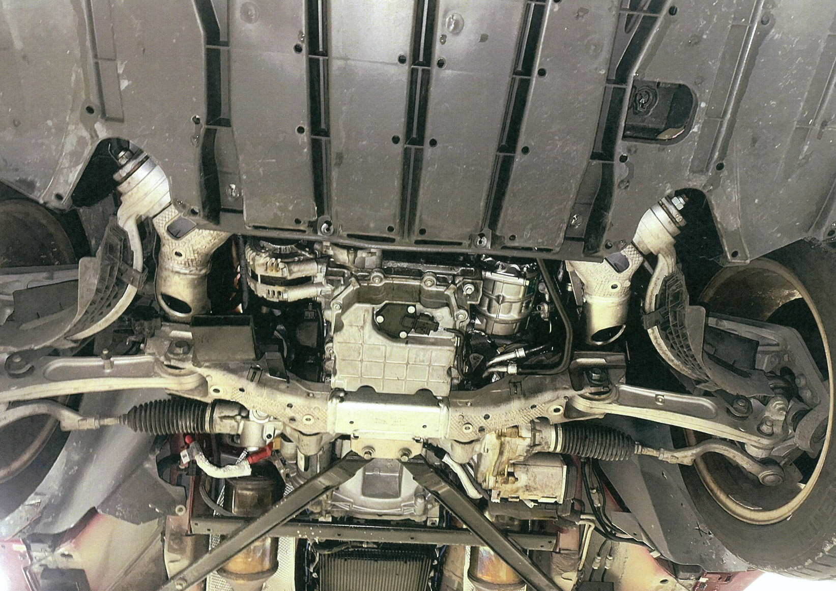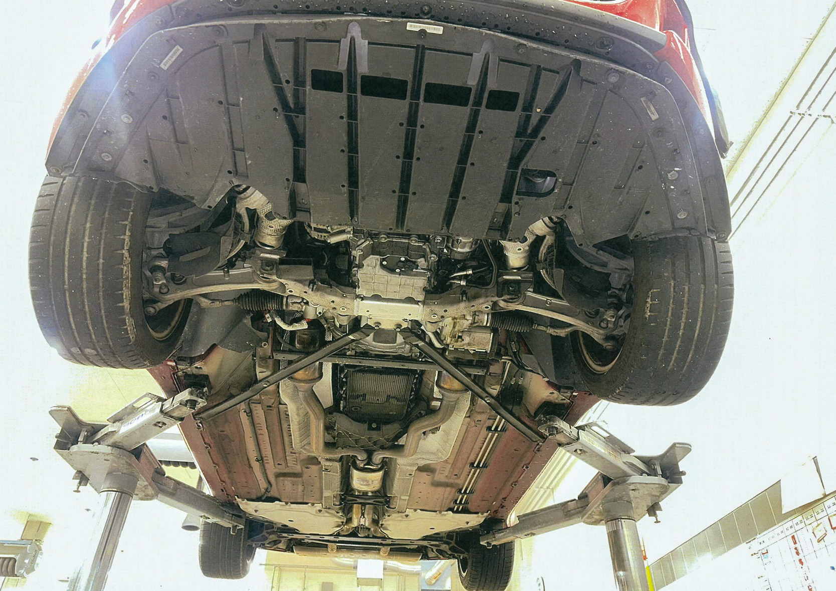 Fタイプの下廻りは意外と無防備なのが印象的で同年代のゴルフ7のアンダーカバーと比べても下廻りは丸見えであり、大雨時の冠水した道路を走行してしまったら、オルタネーターやステアリングギヤボックスは真っ先に故障しそうなレイアウトである。