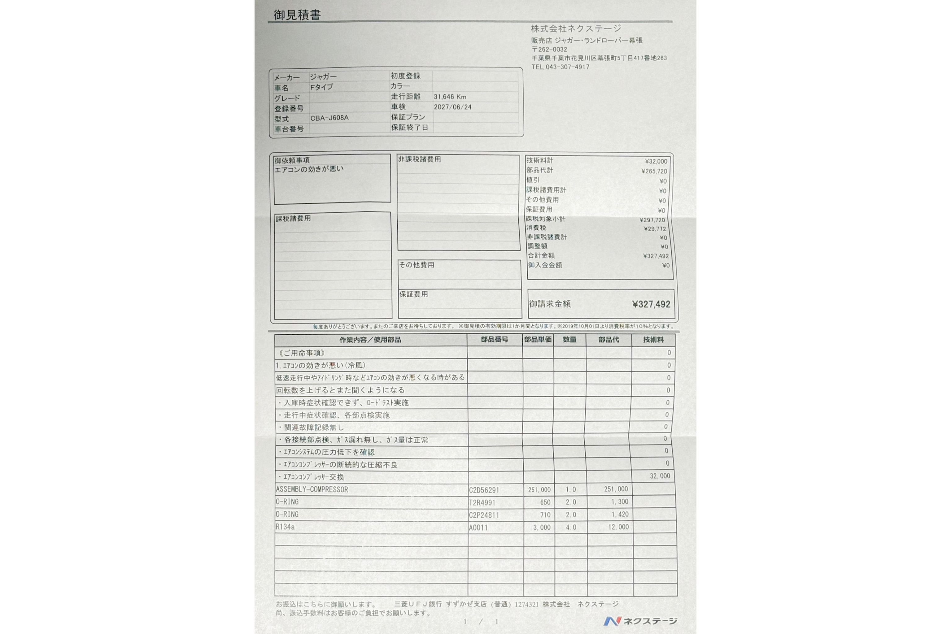 ジャガーFタイプのエアコンコンプレッサーが故障していた!正規ディーラーでの交換工賃と作業内容をレポート