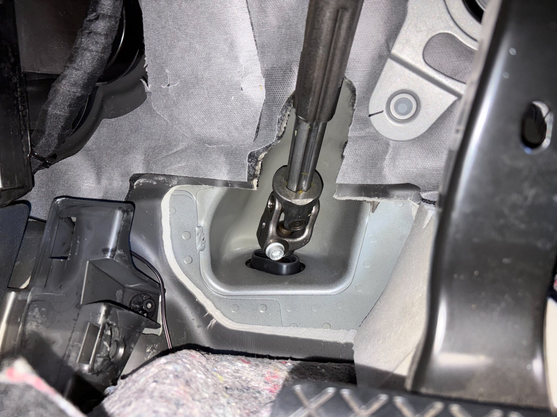 ステアリングギヤボックスを交換するにはメンバーを取り外していく必要があるので先ずはメンバーを取り外す為に室内からユニバーサルジョイントの連結を外していく。