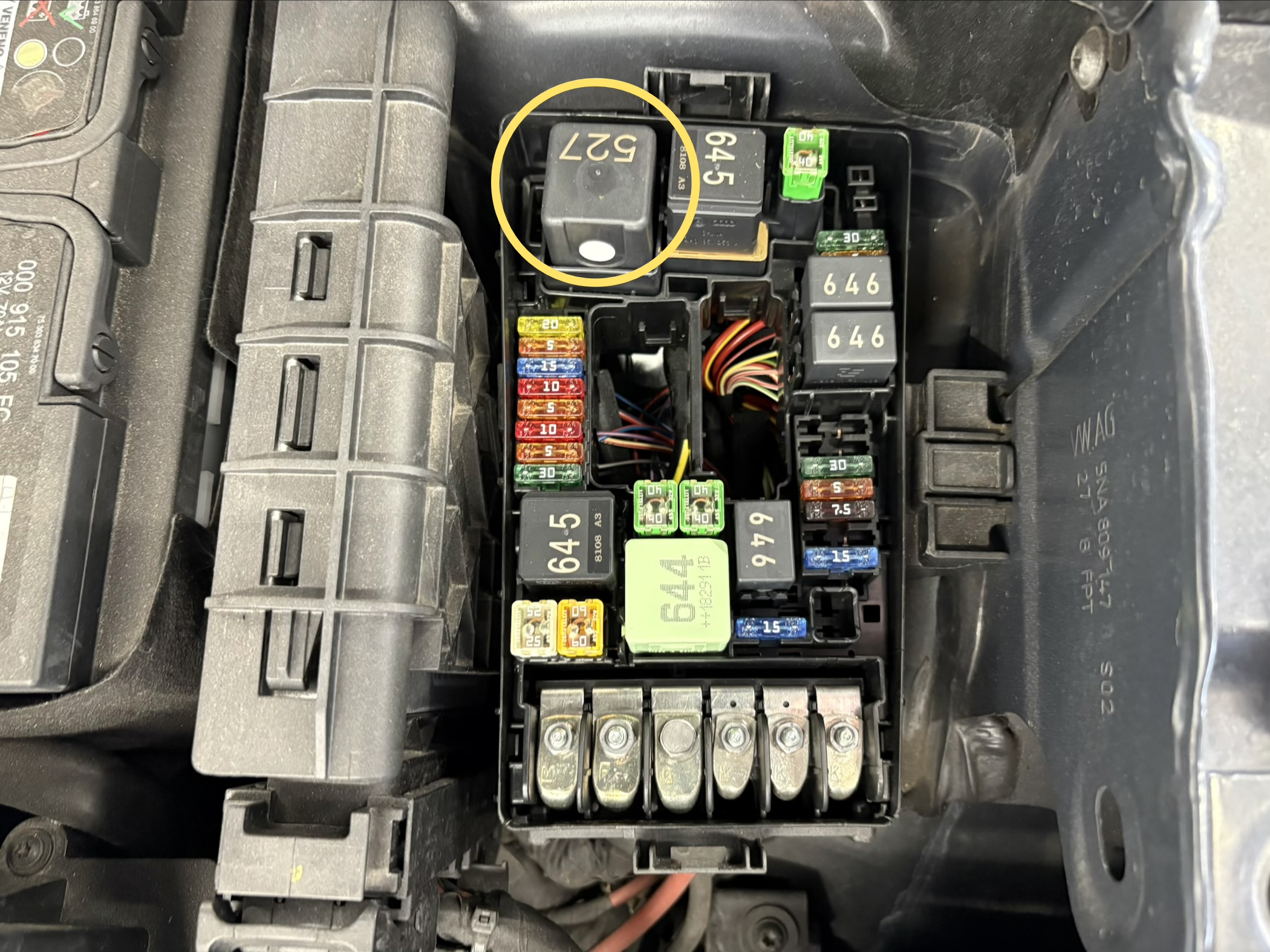 ②ヒューズボックス左の上の1番大きい「527」と印字されているリレーを取り外す。