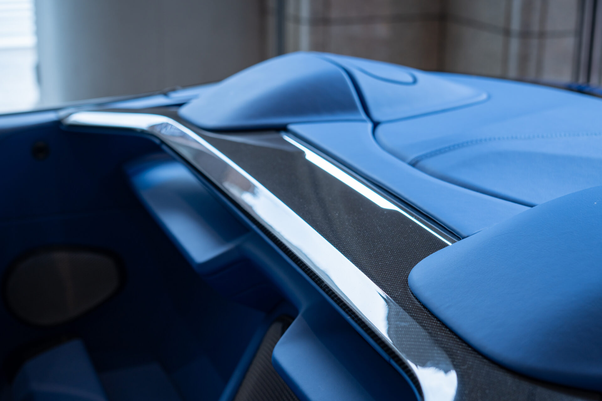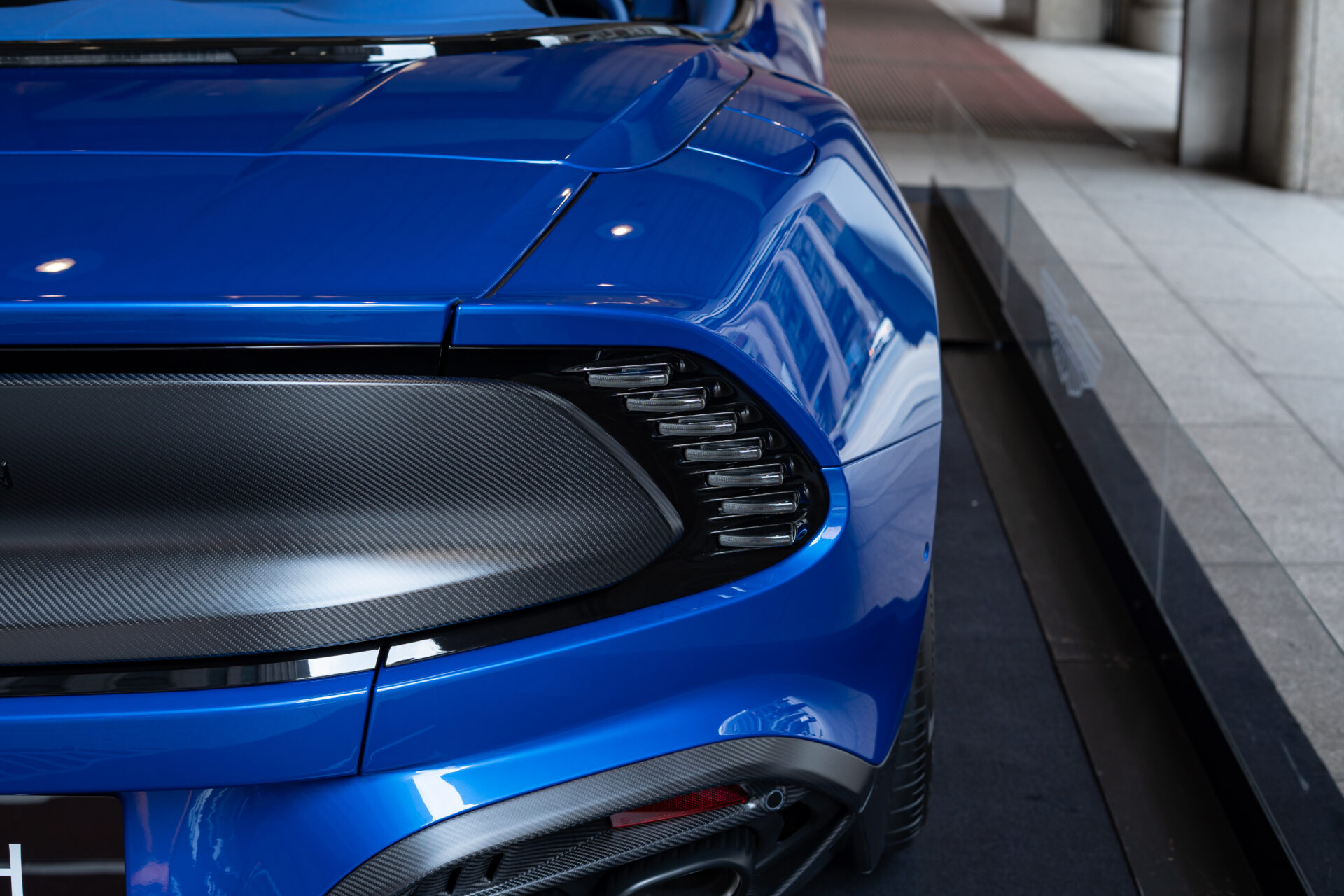 ヴァンキッシュ ヴォランテでは、これらのインテークがIon Blueのボディカラーと相まって、より鮮烈なコントラストを形成され、カーボンファイバーの織り模様がクリア塗装で露出しメカニカルな美しさが強調されている。