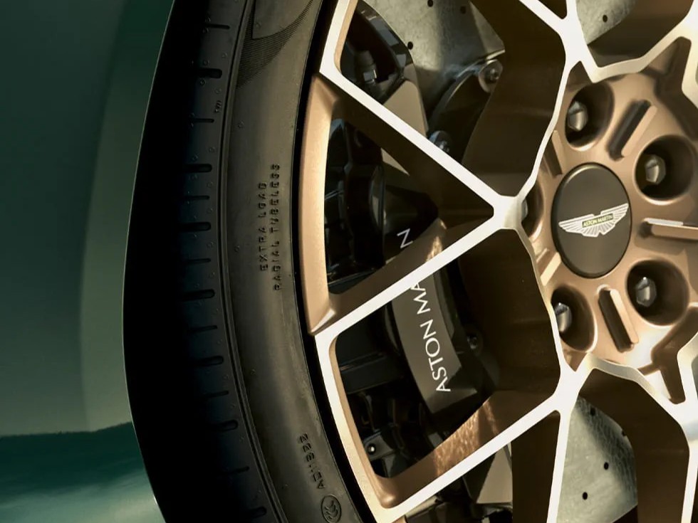サイドデザインの要となるのは、アストンマーティンオリジナルの鍛造アルミホイール。軽量かつ高剛性を実現し、スポークデザインはエッジの効いた形状で、力強さと上質さを演出している。