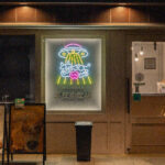 入口の牛と宇宙戦の可愛らしいネオンの看板が目を引き、店内はシンプルで木目調のインテリアでテイクアウトがメインだがイートインスペースもあって狭めではあるが、カップルや一人客がアイスを楽しむことができる空間になっている。