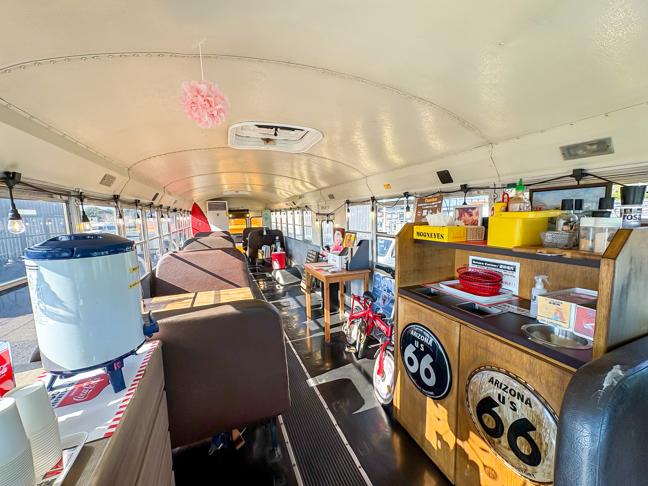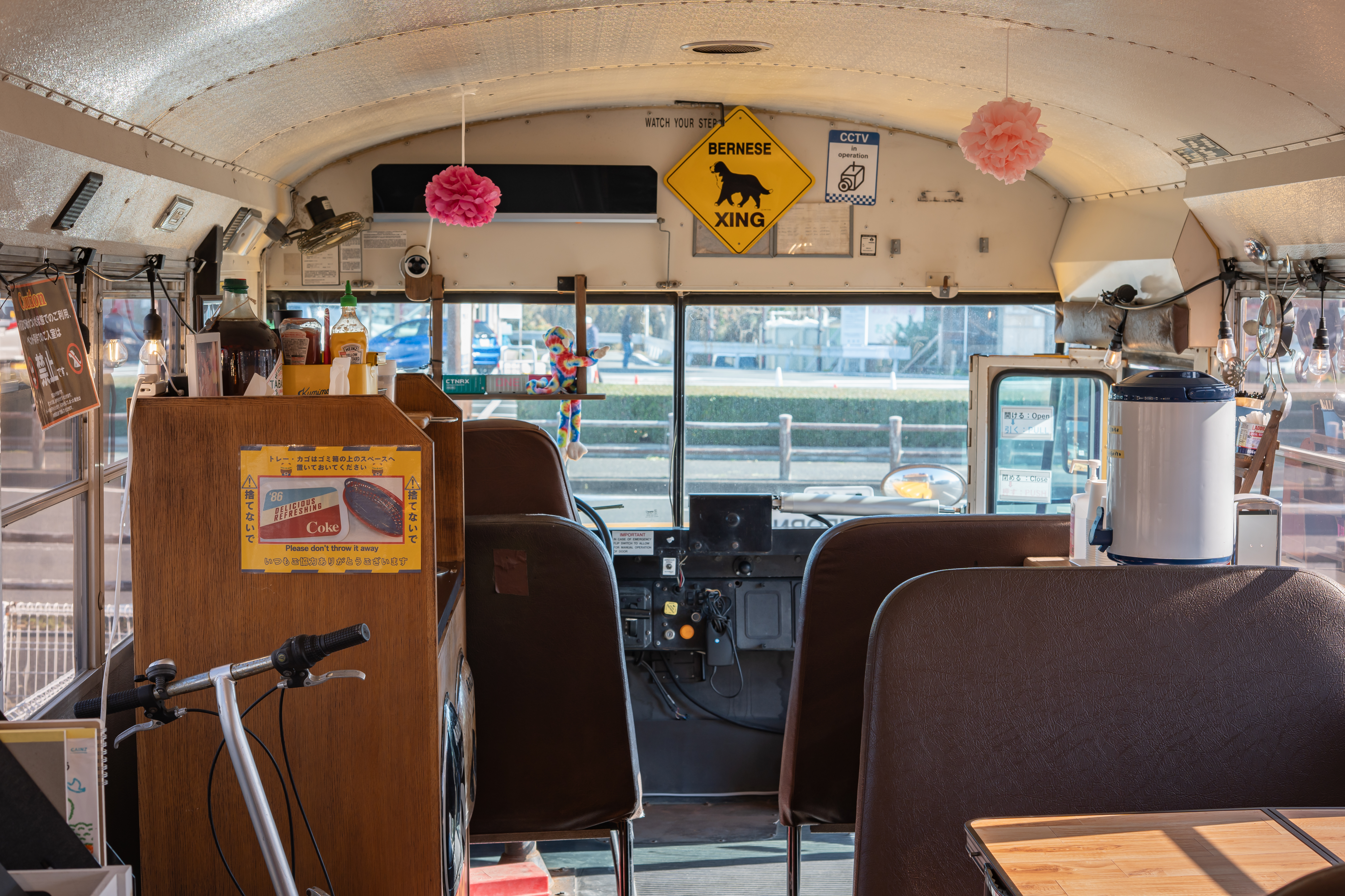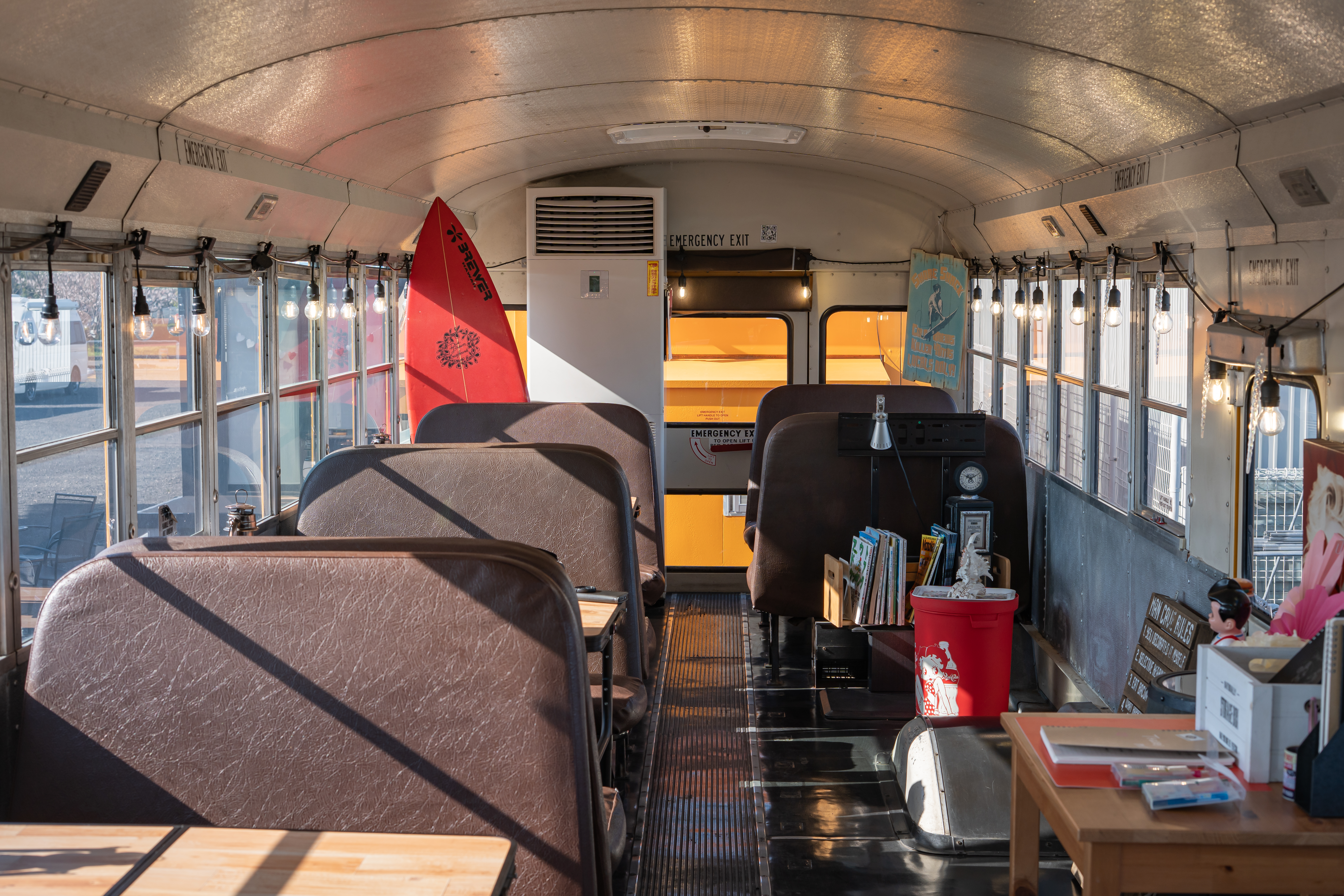 ROMI’sの最大の特徴は、なんといってもこの本物のアメリカンスクールバスをイートインスペースに転用していること。「RIVERSIDE PREPARATORY」の文字が入ったAmTranのバスをそのまま持ってきて、中をカフェとして改装している。