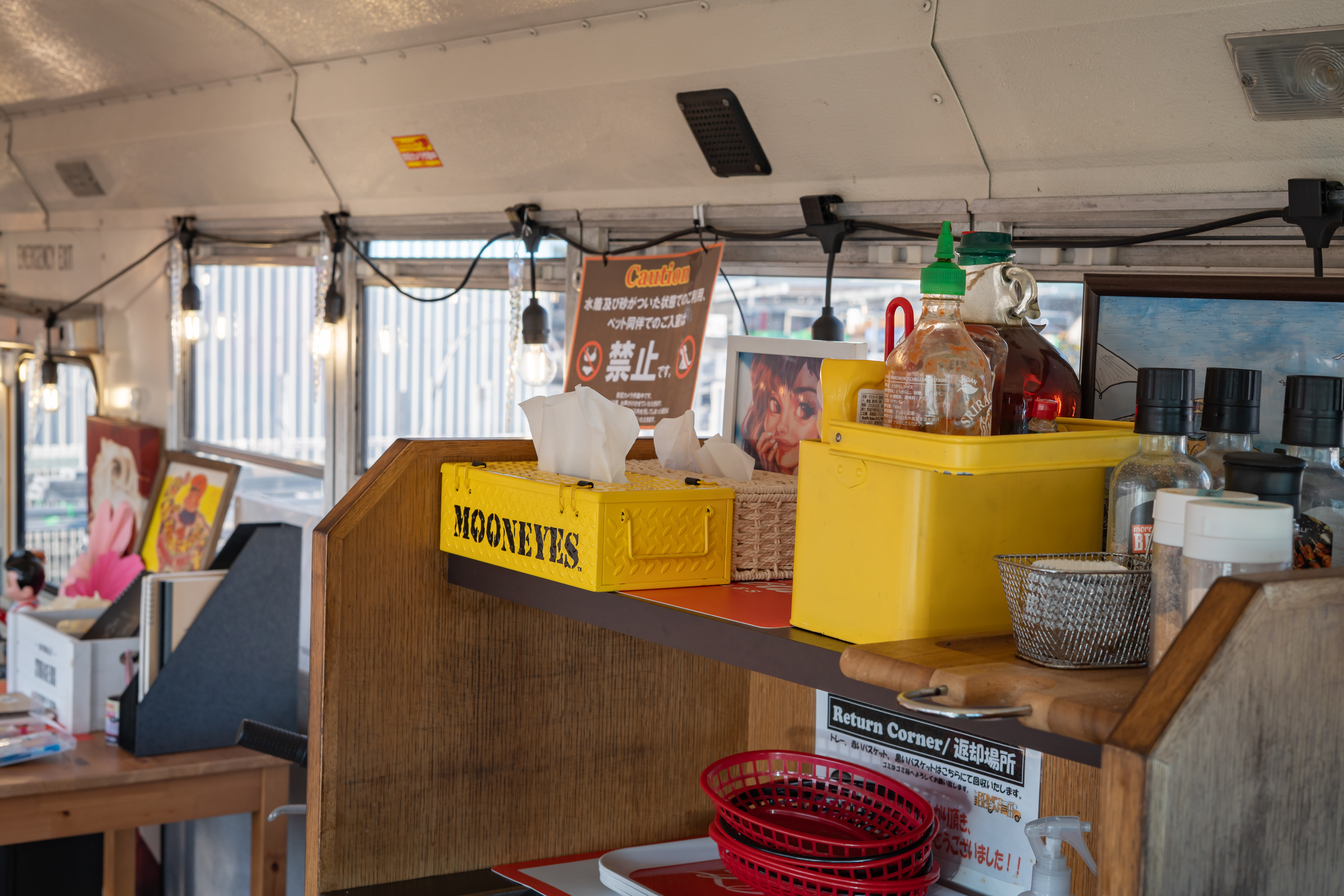 内部にはRoute 66のサインMOONEYESのステッカー、赤いサーフボードなどアメリカンなインテリアが所狭しと並んでいて、まるでカリフォルニアのダイナーに迷い込んだような気分になれる。